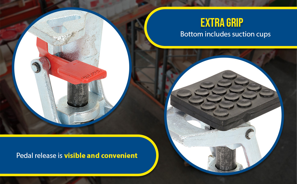 This one of a kind floor lock includes an adjustable height foot pad that will work on carts with different caster heights. The adjustable height feature provides uniform locking and safety unlocking force for better ergonomic operation. This feature also keeps the floor lock working properly as spring and pads wear over time. Height is adjustable by turning the bottom pad. The bottom pad includes suction-cups for extra grip.