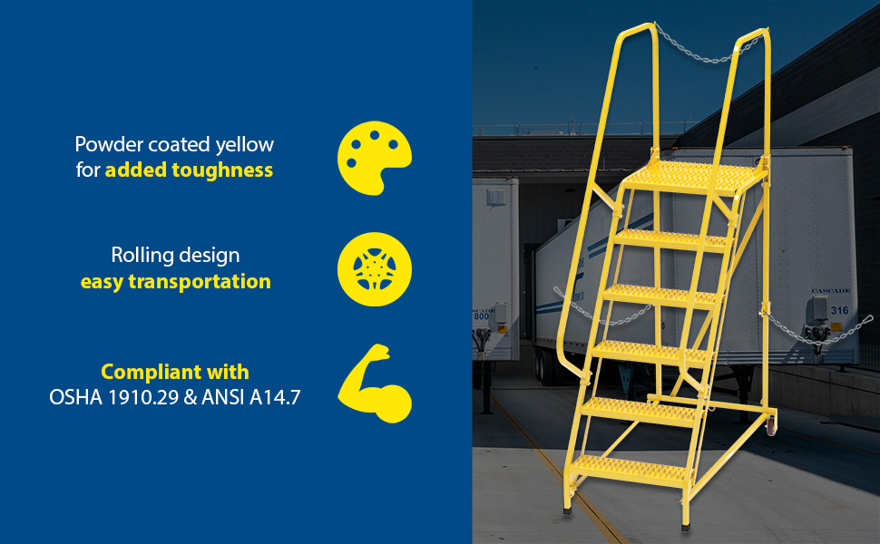 Semi-Trailer Access Ladders are for use getting into Semi-Trailers. Tilt the unit to allow for portability. Units roll on 4" poly-on-poly wheels. Constructed of square tubing framework which handles uniform capacities up to 350 lbs. Features 30" high removable hand railing, access chain, 21" deep top platform, and an industrial baked-in blue powder coat finish for toughness. Each step measures 24" wide by 7" deep and is spaced 10" apart. Climb Angle is 58 degrees.