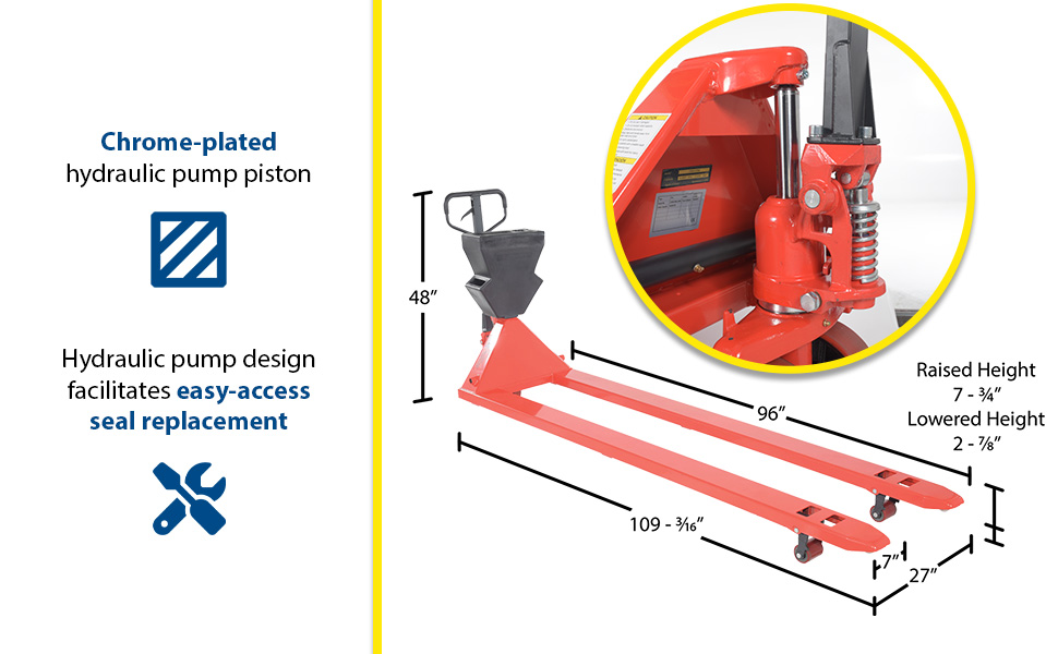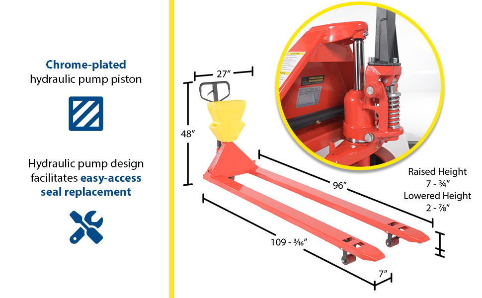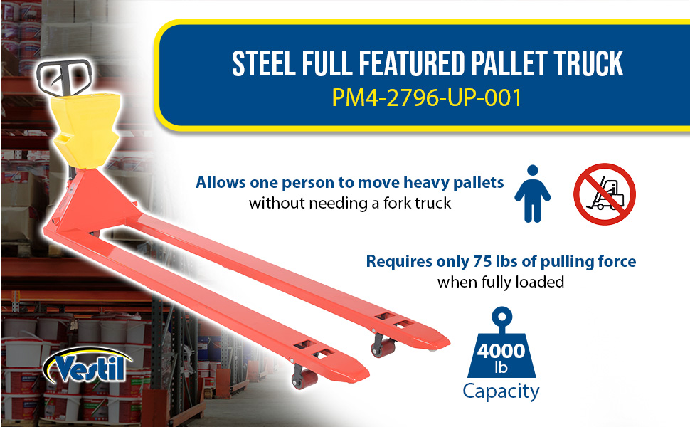 PM4-2796-UP-001 PM4-2796-UP-001Steel/Plastic Pallet Truck 109-3/16 In. x 27 In. x 48 In. 4000 Lb. Capacity Red with Yellow P-CaddyUniform Capacity (lb.): 4000