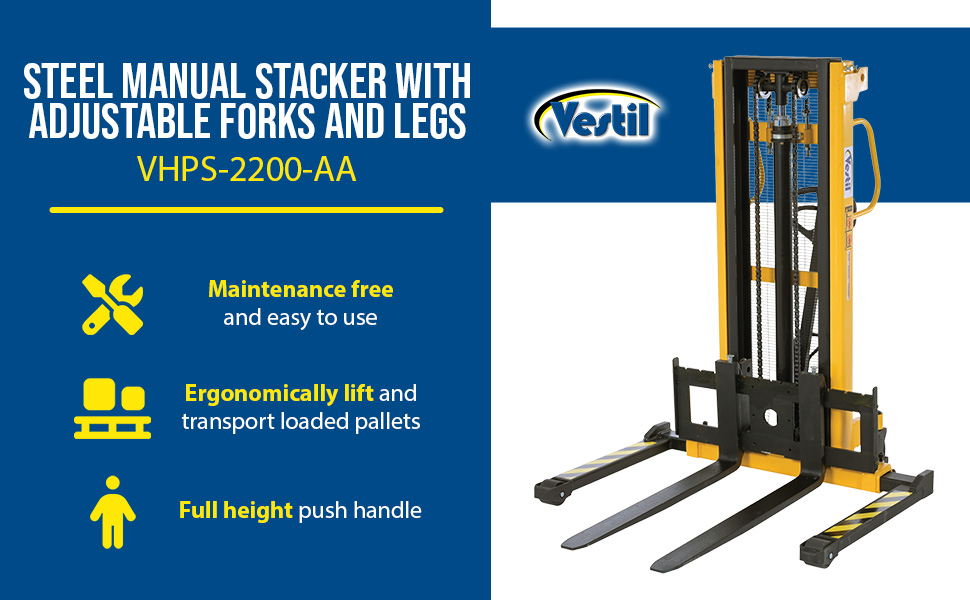 VHPS-2200-AA VHPS-2200-AASteel Manual Stacker Adjustable Forks/Legs 2,200 Lb. Capacity BlackUniform Capacity (lb.): 2,200