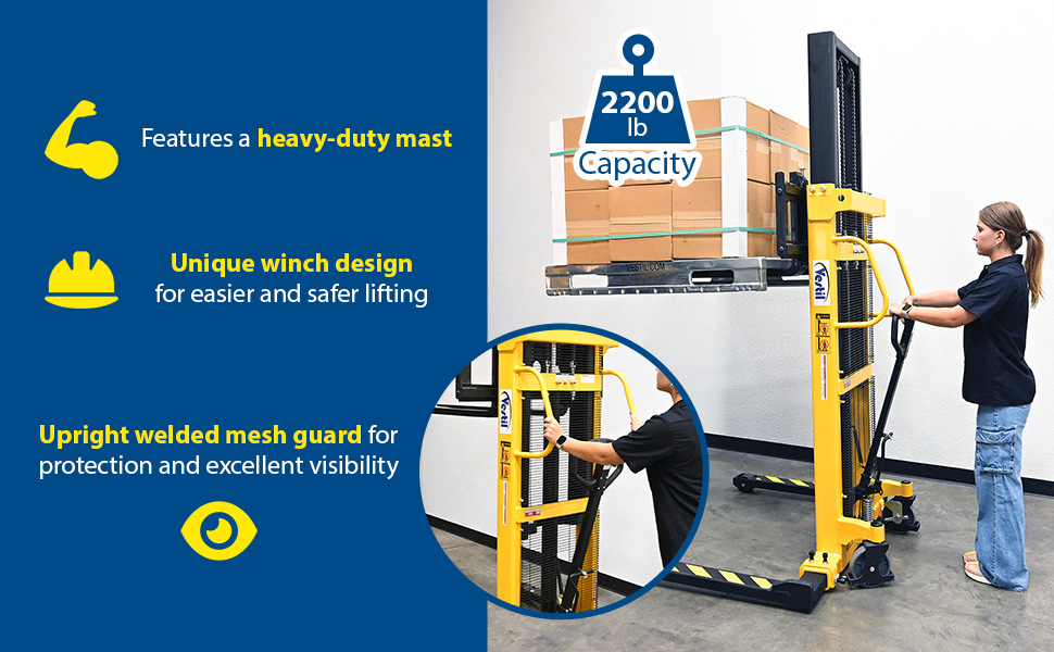 VWS-770-AA VWS-770-AASteel Stacker with Adjustable Manual Hand Winch 770 Lb. Capacity Black / YellowUniform Capacity (lb.): 770