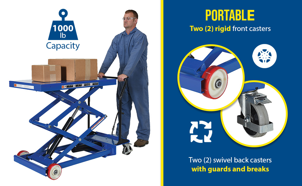 CART-1000-D-FR CART-1000-D-FRSteel Premium Double Scissor Lift Cart with Foot Release 24 In. x 40-1/2 In. 1000 Lb. Capacity BlueUniform Capacity (lb.): 1000