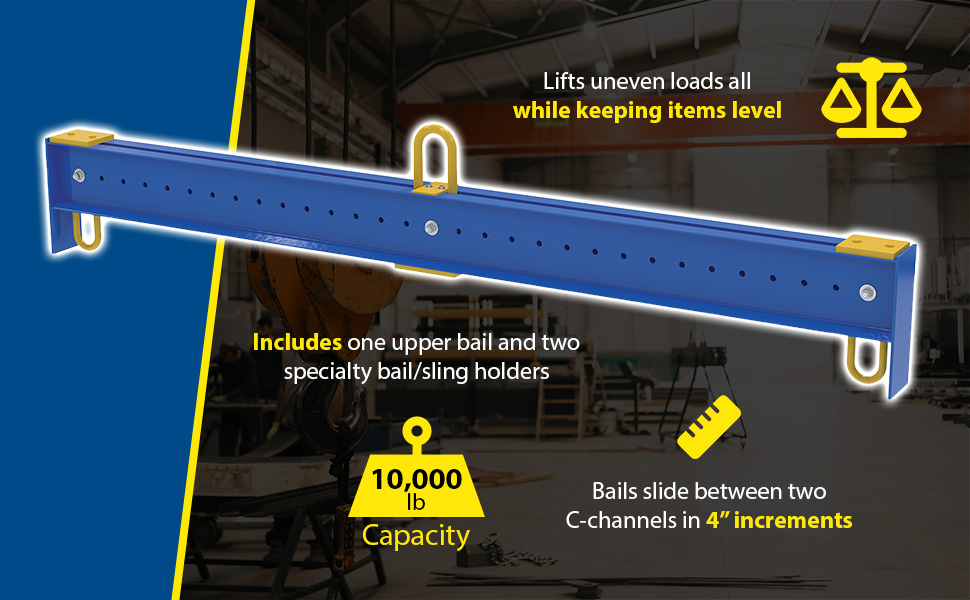 Lift uneven loads, while keeping them level! Includes two lower bails and one upper bail. Adjust bails in 4" increments. The bails slide between two 5" high C-Channels (8" high model SBM-80). Meets ASME B30.20-1993 standard. Baked-in powder-coated finish for added toughness.