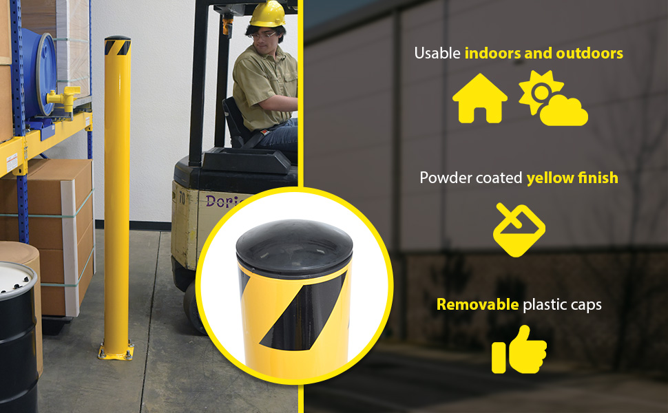 Bollards can be used both indoors and outdoors to protect work areas, racking and personnel. Caps are made of plastic and are removable when necessary. Bollards may be filled with concrete. Base plate includes four (4) pre-drilled mounting holes. Mounting kits and replacement caps available. Baked in powder coat or hot dipped galvanized finish for added toughness.