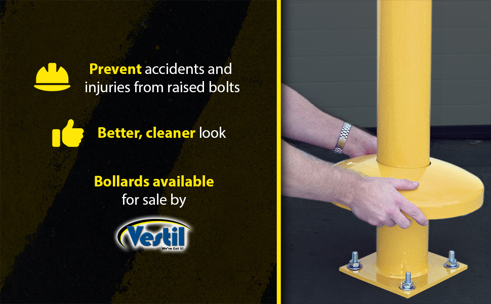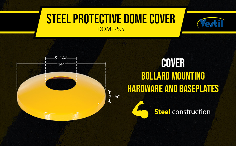 Protective Dome Covers for Bollards prevent accidents and injuries from people tripping over raised bolts. Easy to use device slides over bollards covering mounting hardware and base plate for a nice clean finish. Durable yellow powder coat finish. Steel construction. No hardware required.