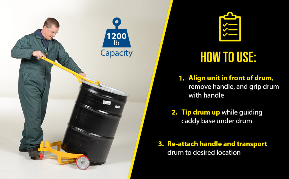 Reduce injuries caused by manually lifting and moving drums. Transport (1) 55 or 30 gallon drum or (2) 5 gallon pails with the Low-Profile Drum Caddy. To use: align unit in front of drum, remove handle, and grip drum with the handle. Tip drum up while guiding the caddy base under the drum. Re-attach handle and transport drum to desired location. Unit rolls easily on two 6"x2" rigid wheels and one 3"x1" swivel caster. The removable handle doubles as a bung nut wrench and seal remover. Cradle height is 1/2". Inside cradle diameter is 23-1/2". Steel construction. Yellow painted finish. US Patent Number 6682084.