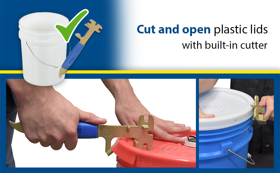 A must-have product for anyone using five gallon plastic and steel pails. The cutter is used to cut a slit in the lid lip of the pail to enable the lid of the plastic pail to be removed. The side guide conveniently slides under the lid lip for easy removal of the lid. The end hook is used to open steel pails. Just hook the lid lug and pry open. The opposite end is used to close and seal the lid by bending the lip back around the steel pail top. Not for UN rated pails.
