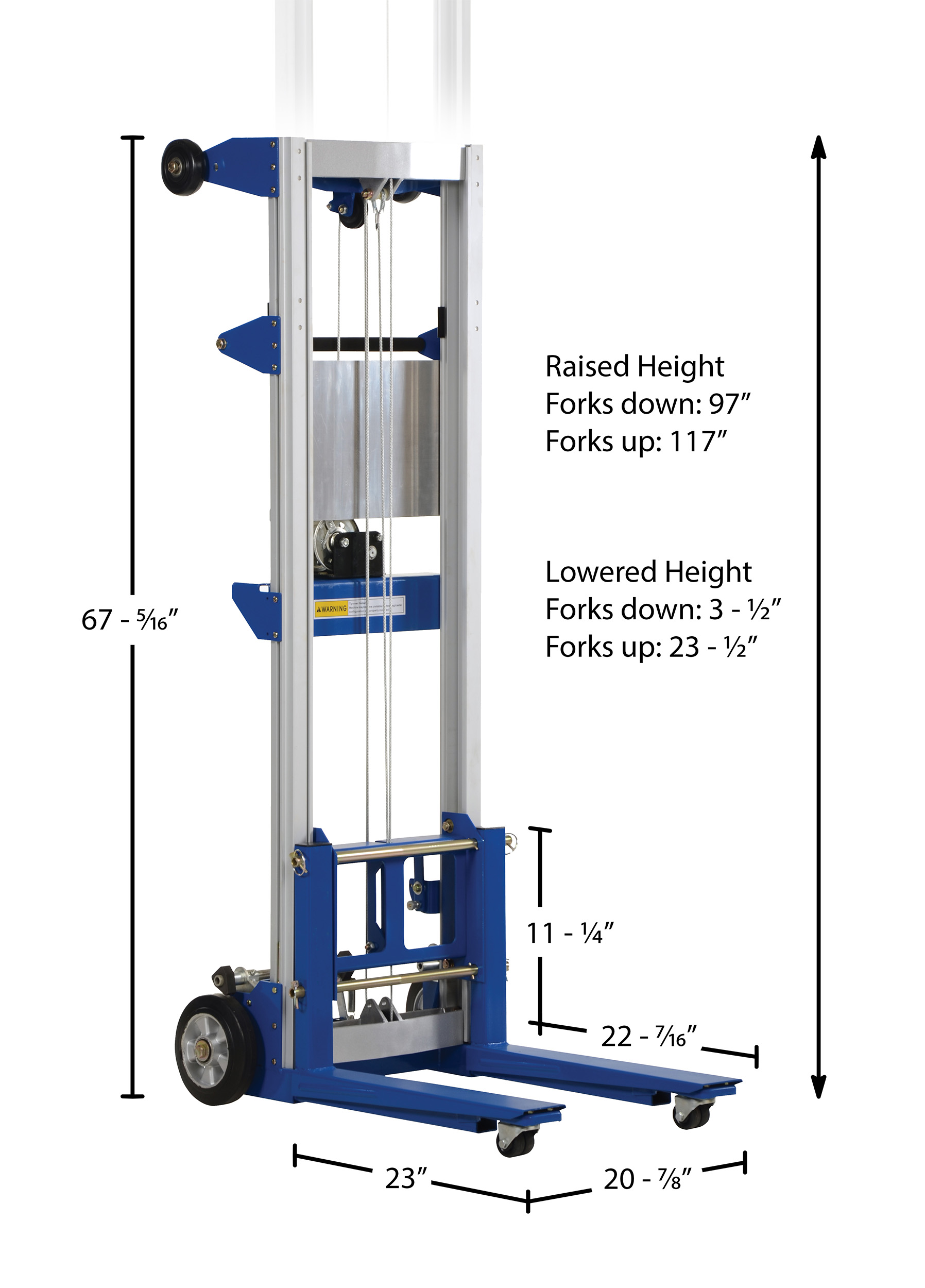 | Raised Height with Forks Up (in.): 117 | Fork Width (in.): 4 | Fork Height (in.): 1-3/4 |