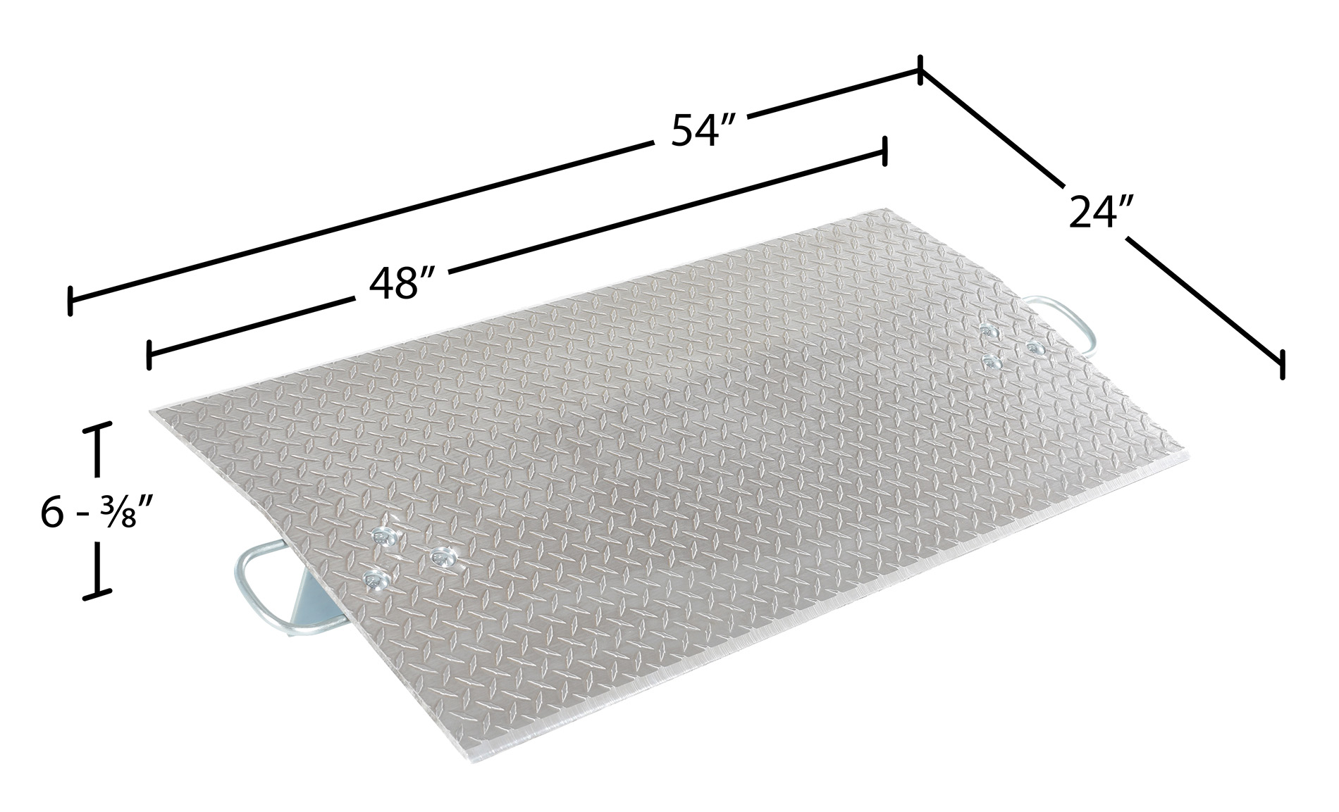Aluminum Economizer Dock Plate Usable 48 In. x 24 In. 3/8 In. Plate Thickness 5200 Lb. CapacityThe aluminum economizer dock plate is an economical way to speed up truck loading and unloading. The unit spans the opening between dock and trailer to allow pallet or hand trucks along with traffic to safely move in and out of the trailer. The dock plate is constructed of high strength, non-skid aluminum alloy tread plate. The lightweight design with bolt on zinc plated legs and handles on each side makes portability easy. Locking legs for OSHA compliance. Not for use with fork trucks.