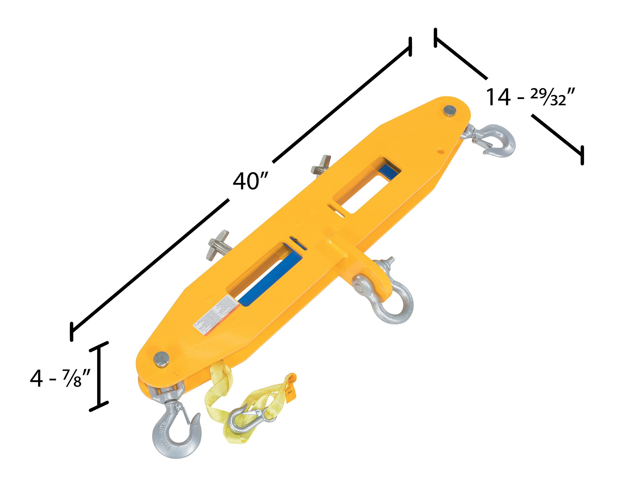 Steel Forklift Lifting Beam 40 In. x 4-1/4 In. x 14-29/32 In. 6,000 Lb. Capacity YellowA forklift lifting beam is the perfect asset for maneuvering and transferring heavy objects. The centrally located hook between two fork pockets allow the user to safely attach to the unit and transport to the desired location. Hooks are also attached to the outside of the unit for a more secure lifting experience. The strong steel construction with a bright finish enables high visibility from both near and far. Secure to the fork truck by means of a 48" long safety restraint and screw clamps.