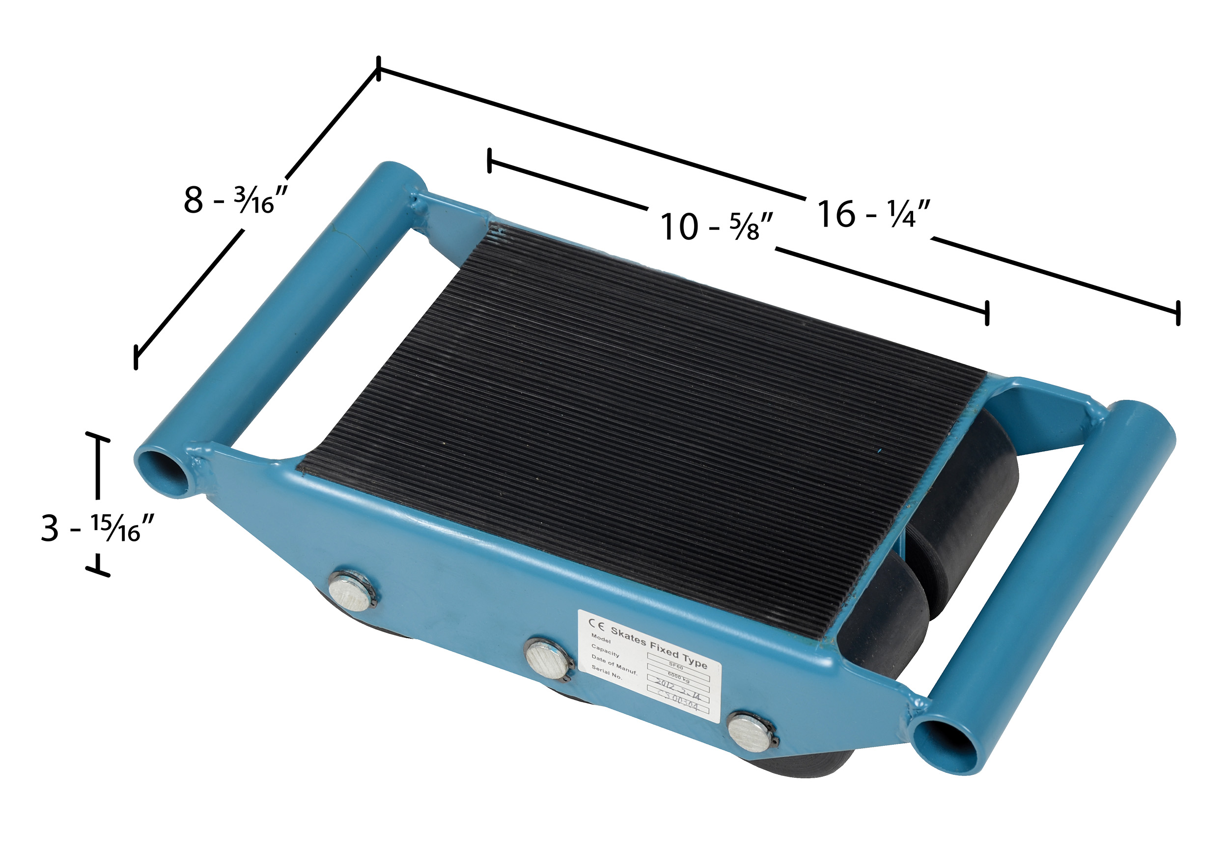 Steel Fixed Machinery Skates 16-1/4 In. x 8-1/2 In. x 4 In. 12,000 Lb. Capacity BlueThis machinery skate is designed to move heavy equipment and machinery. Nylon wheels are strong and will not mark floors. The top of each skate includes a rubber surface for extra grip. Steel construction with handle to carry and position. On this fixed skate dolly size is nonadjustable and wheels are rigid. Designed primarily for moving in straight lines.