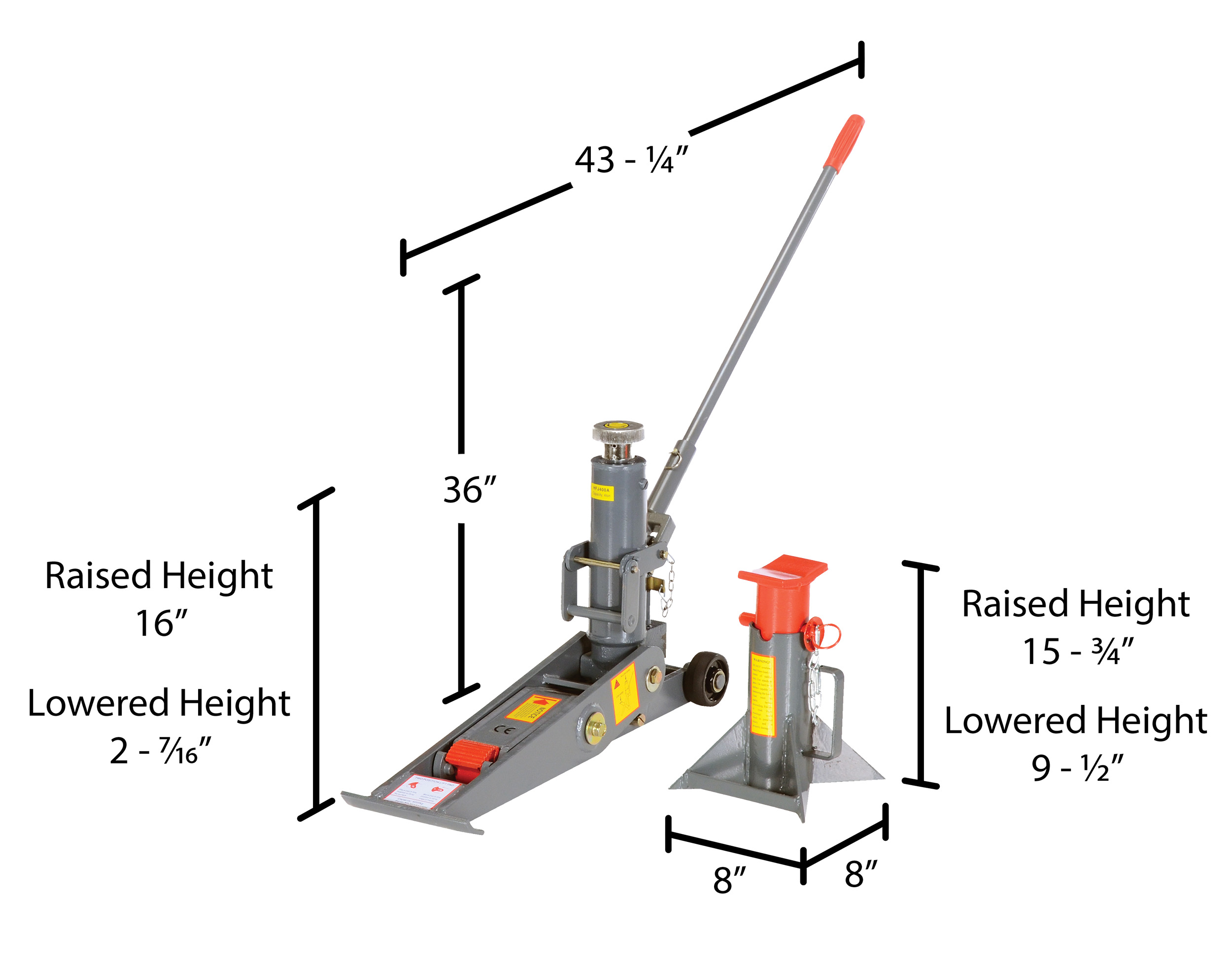 | Jack Stand Height (in.): 9-1/2 | Jack Stand Raised Height (in.): 15-3/4 | Lowered Height full pad (in.): 2-7/16 |
