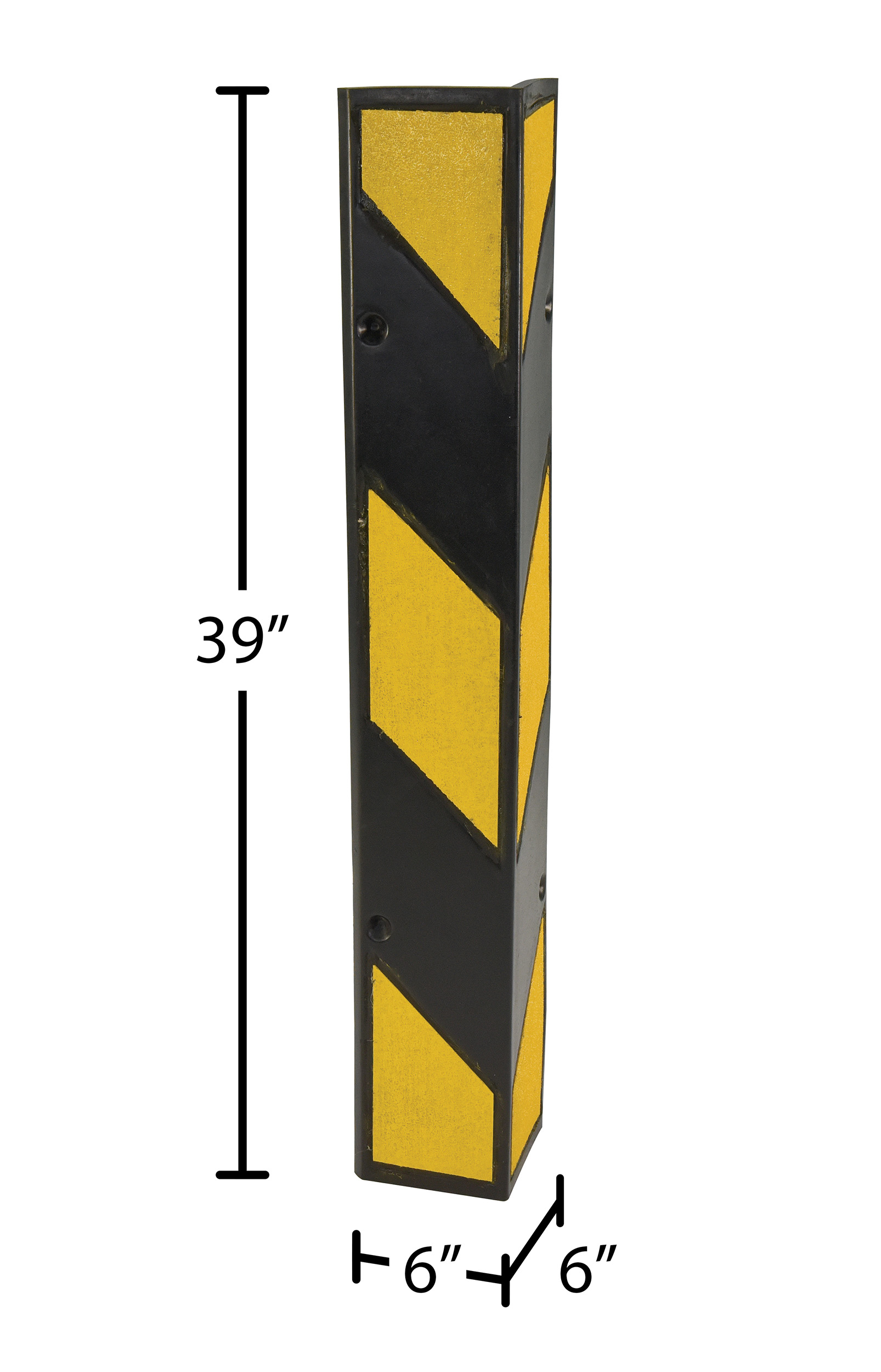 This heavy-duty corner protector is designed to protect corners from damage. Extremely versatile protection for in warehouses, offices, overhead door frames and tracks, or any ninety (90) degree corner. Made from black molded rubber. This corner protector includes reflective safety yellow tape for higher visibility. No pre-drilled holes.