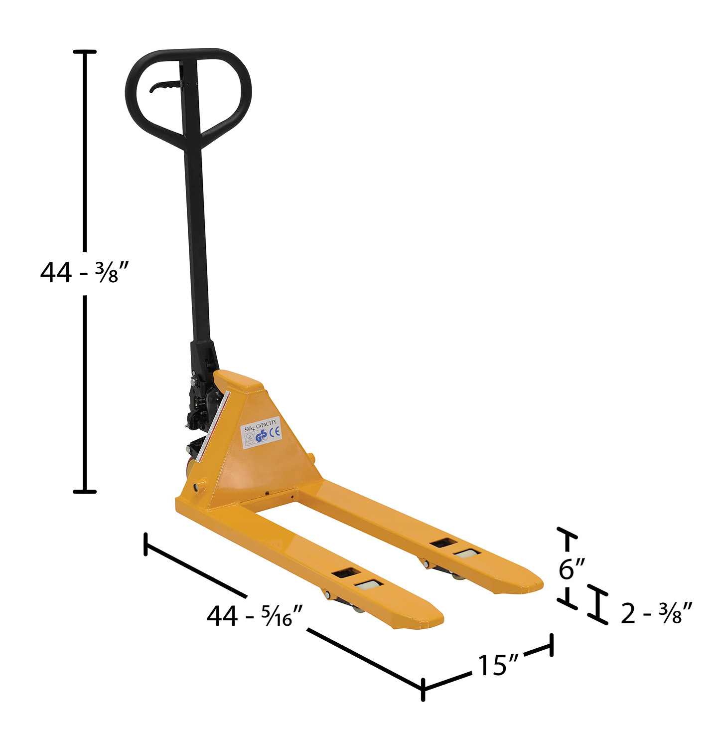 Steel Mini Hand Pallet Truck 45 In. x 15 In. x 45 In. 1100 Lb. Capacity YellowA mini hand pallet truck is an asset to a variety of manufacturing and shipping facilities. A robust construction allows the user to comfortably and easily transfer goods, while minimizing manual labor. The unit is lightweight for simple portability and compact enough to reduce storage space when not in use. Smooth finish for simple cleaning and handling during use.