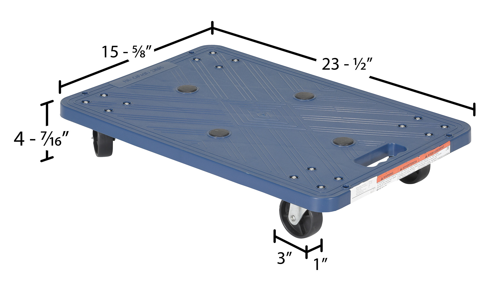 Polyethylene Dolly 23-1/2 In. x 15-5/8 In. x 4-7/16 In. 220 Lb. Capacity BlueThis plastic dolly is one (1) piece molded polyethylene. It is very lightweight and easy to clean. Will not rot, warp, dent, or splinter like wood dollies. Ideal for the food service industry. Features a molded handle. This allows dolly to be easily carried up and down stairs. Unit comes standard with poly-on-poly casters.
