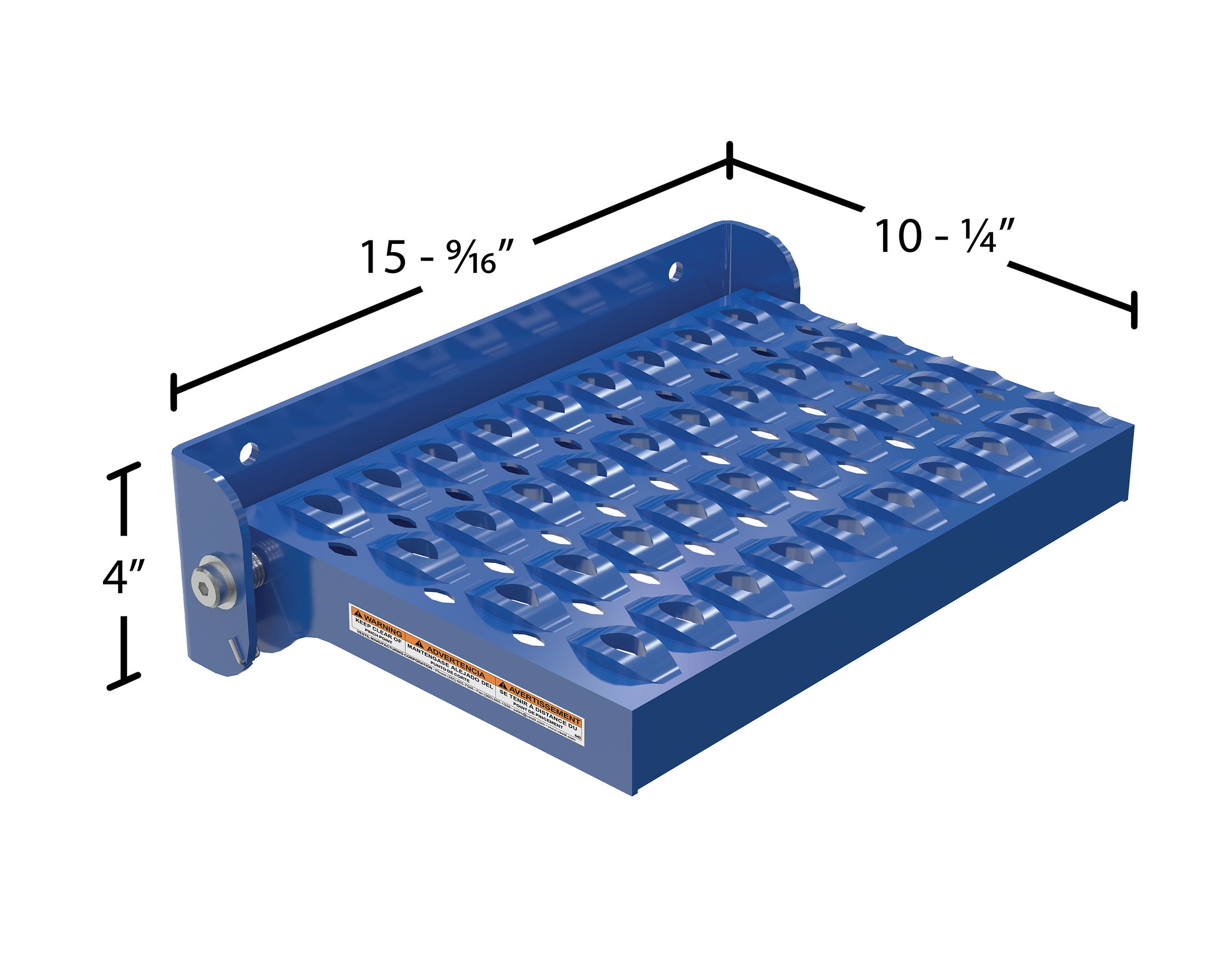 The spring loaded Serrated steel fold-up step automatically returns to vertical position when not in use. Steel construction with a serrated surface for traction and powder coat blue finish. Mounting holes are pre drilled, fasteners are not included.