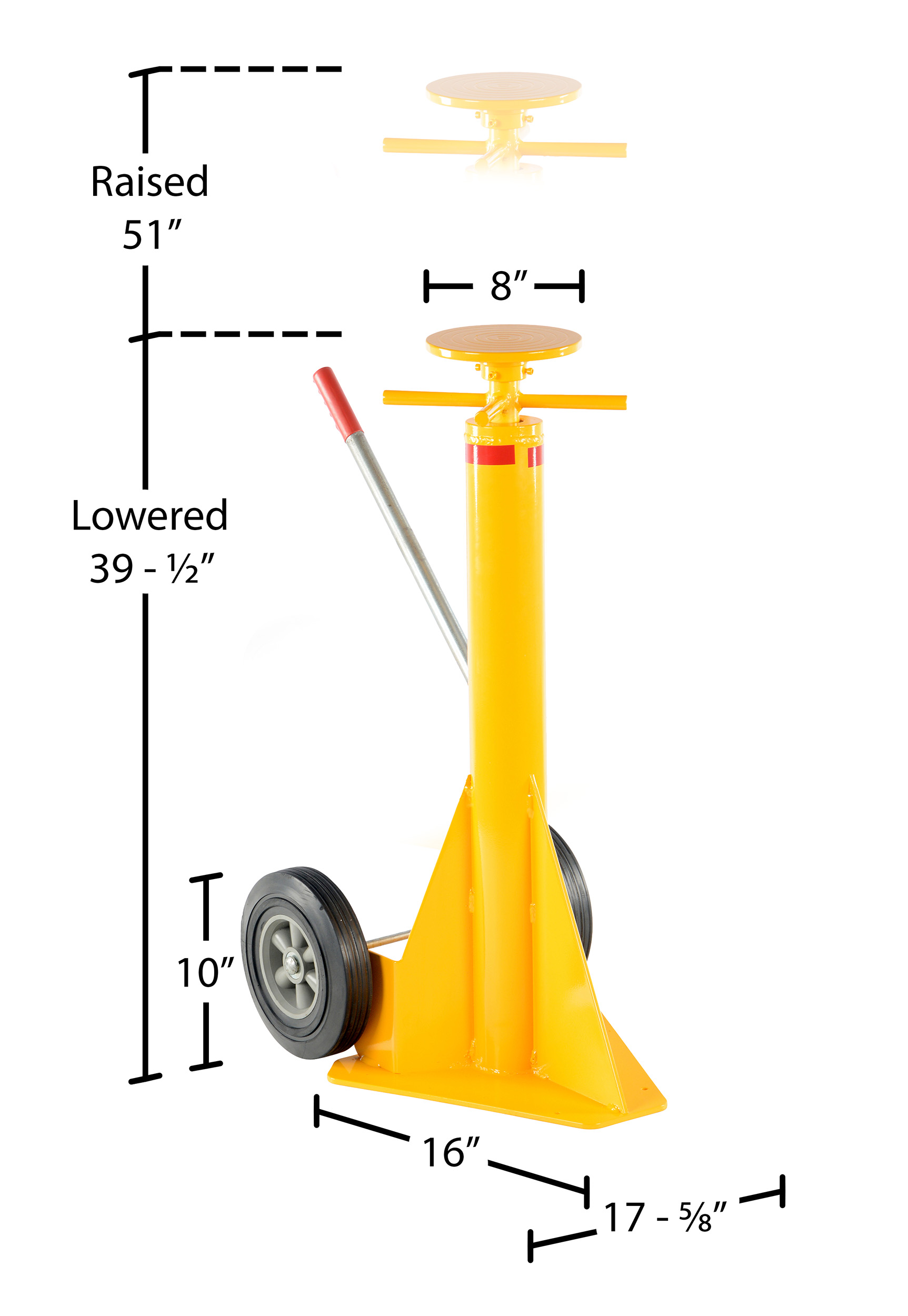 Trailer stabilizing jacks are used to prevent up-ending of semi-trailers when they are not connected to a tractor during loading and unloading operations. Throughout the loading and unloading process it is always recommended to use two jacks, one on each side of the front of the trailer. The trailer must be situated on a flat, stable and improved (preferably concrete) surface, while the jack sits perpendicular to the underside of the trailer. Every jack is built of a high strength steel construction with a flush-type Zerk fitting for lubricating ACME screw. A yellow powder coat finish and a reflective collar for visibility at night are both included. Each jack meets OSHA regulations when used with wheel chocks. **The color of handles included with models may vary between red and black**.