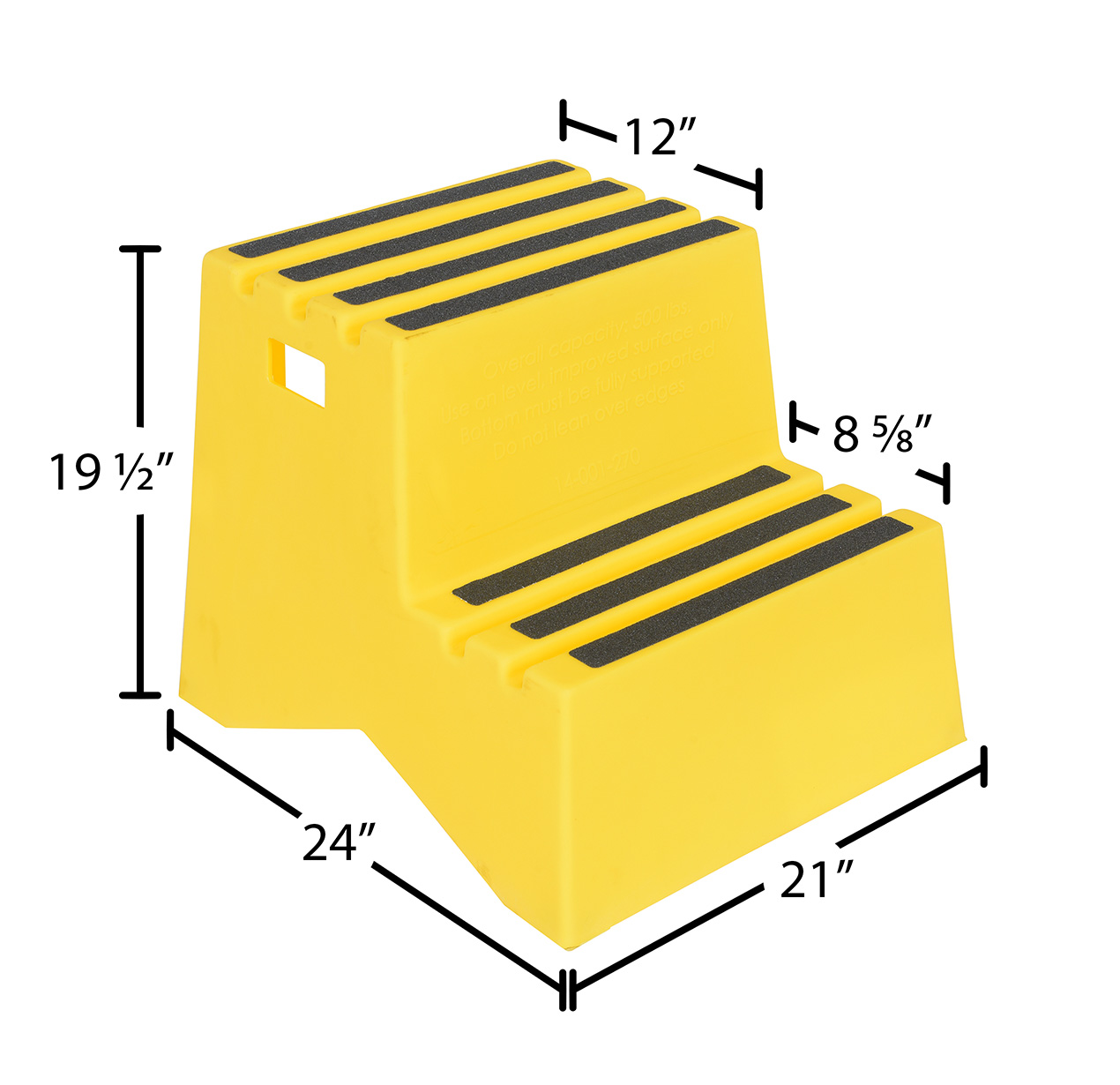Polyethylene 2-Step Step Stool 500 Lb. Capacity YellowWhen items are out of reach, do not strain, simply step up with this Polyethylene step stool. The two (2) step unit has rear opening access storage compartments. This stool has rubber feet and a non-skid tape surface. Hand holes are standard for easy one person transportation.