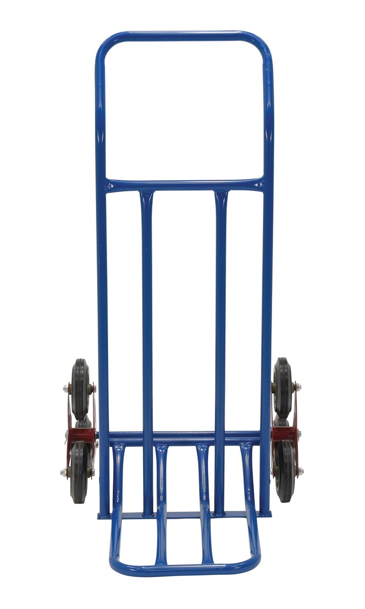 Unique design features tandem triple-wheel assemblies that work great when going up and down stairs. Wheel assembly smoothly rotates as you go up or down each step - eliminates the thud and bump associated with conventional two wheel hand trucks on stairs. Rear wheel assembly also allows hand truck to roll easily on 4 wheels while on flat surfaces. Single loop handle. Steel construction.