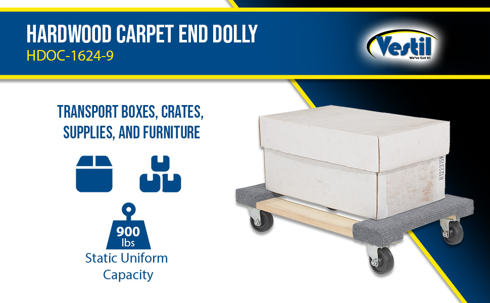HDOC-1624-9 HDOC-1624-9Hardwood Carpet End Dolly 24 In. x 16 In. x 5-3/4 In. 900 Lb. CapacityUniform Static Capacity (lb.): 900