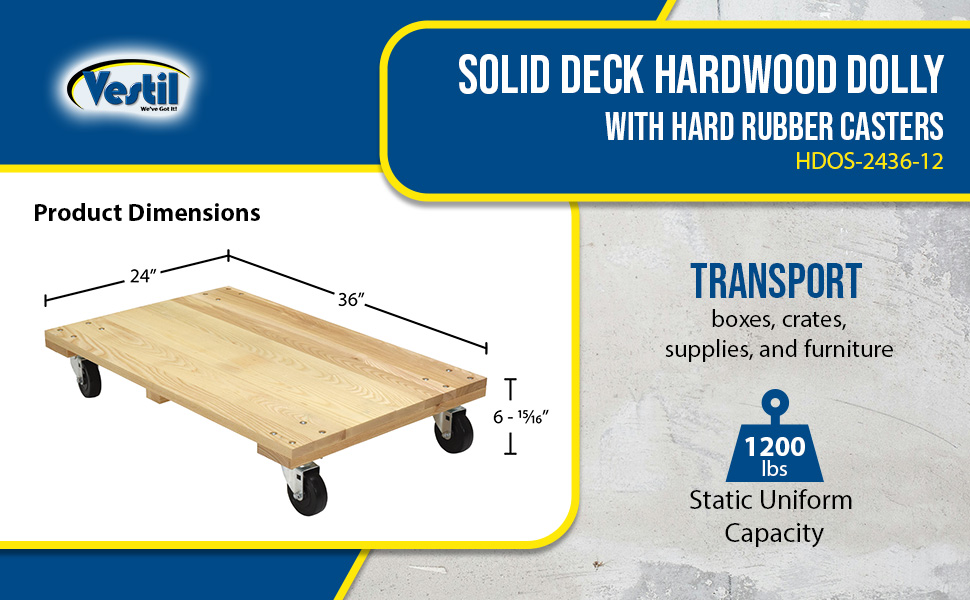 HDOS-2436-12 HDOS-2436-12Hardwood Solid Deck Dolly 36 In. x 24 In. x 6-15/16 In. 1200 Lb. CapacityUniform Static Capacity (lb.): 1,200