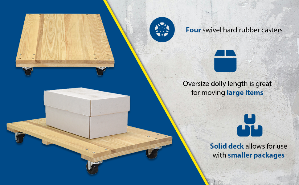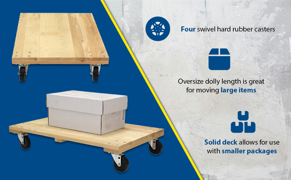 HDOS-1624-9 HDOS-1624-9Hardwood Solid Deck Dolly 24 In. x 16 In. x 6-3/16 In. 900 Lb. CapacityUniform Static Capacity (lb.): 900