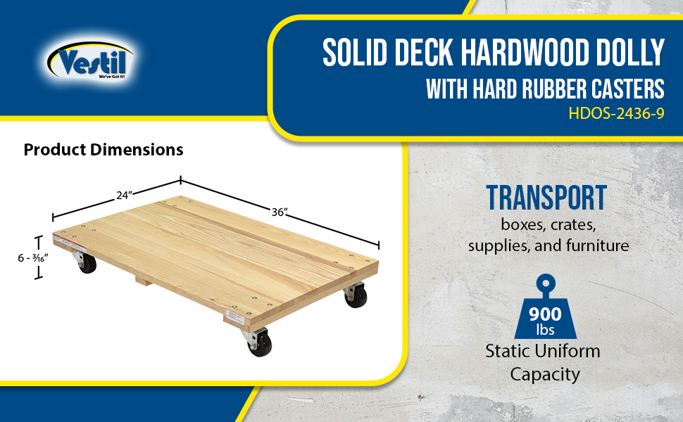 HDOS-2436-9-NM HDOS-2436-9-NMHardwood Solid Deck Dolly with Non Marking Casters 36 In. x 24 In. x 6-3/16 In. 900 Lb. CapacityUniform Static Capacity (lb.): 900