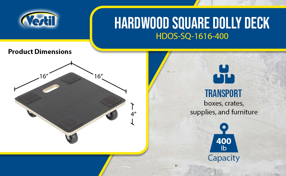 HDOS-SQ-1616-400 HDOS-SQ-1616-400Hardwood Square Dolly Deck 16 In. x 16 In. x 4 In. 400 Lb. Capacity BlackUniform Capacity (lb.): 400