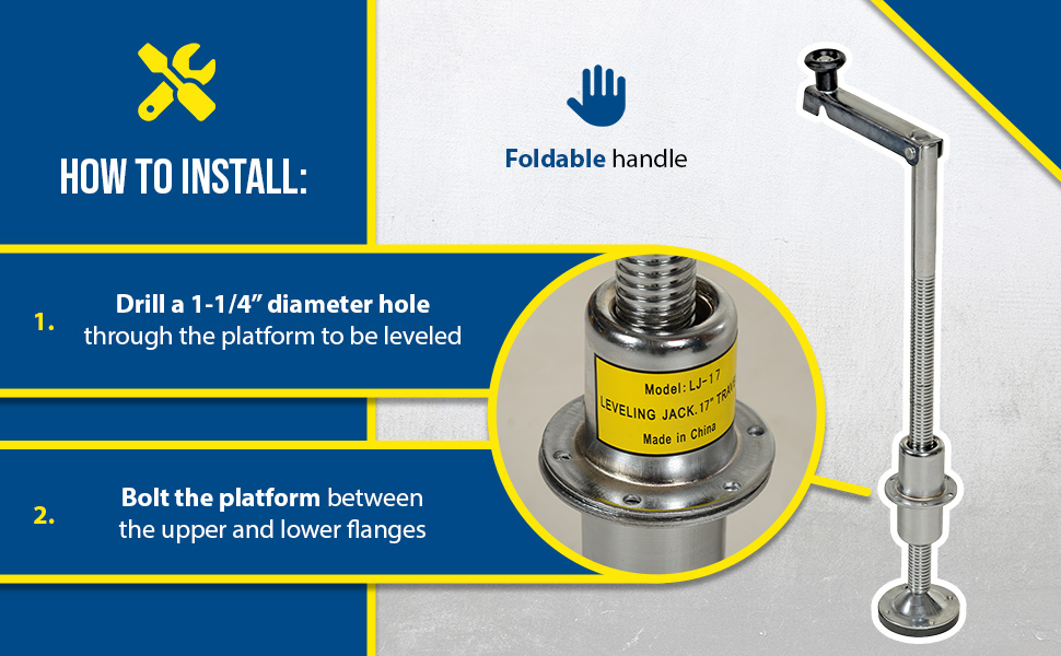 Designed for permanent installation, these screw-style jacks hold platforms and other equipment in place and stabilize them at the required height. Drill a 1-1/4" diameter hole through the platform to be leveled and bolt the platform between the upper and lower flanges of the jack's divided housing. Flanges are 3-5/8" overall diameter, 1/8" thick, and have (6) 1/4" diameter mounting holes equally spaced on a 3" diameter hole pattern. Jacks are made of steel with a polished chrome finish and have an 8-1/4" long handle that folds down when not in use. They stand on a 3-7/8" diameter swivel base that has a slip-resistant rubber pad on the bottom. Screw diameter is 1-1/4". Lift rate is 1/4" per crank revolution.