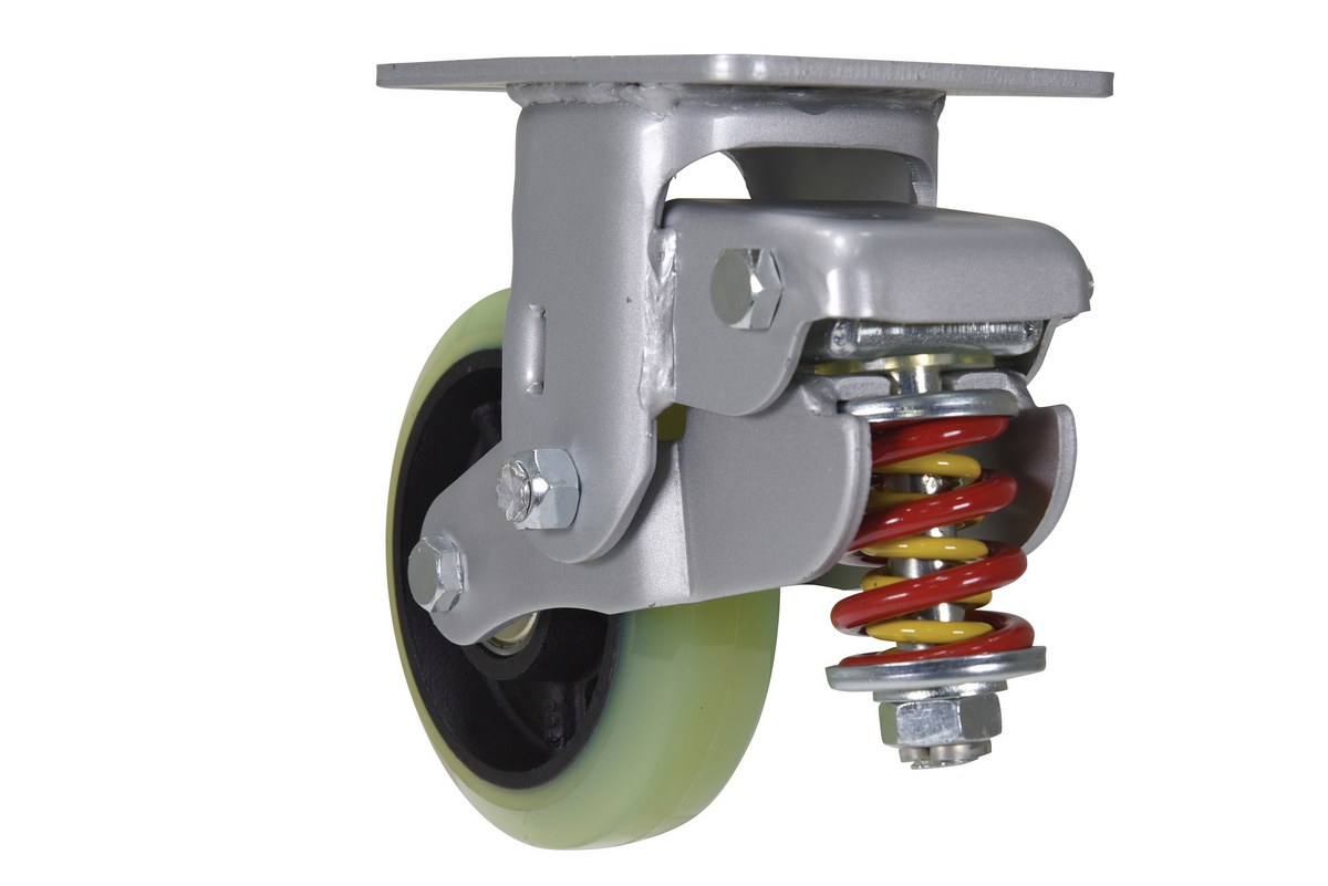 These Japanese engineered casters are one of the only in the market specially designed for spring-loading AND towing applications. Its high-performance polyurethane is abrasion resistant and tolerates longer distances, while providing great absorption. The state-of-theart caster raceway is made up of both a radial bearing that allows for smooth operation for towing applications, and a thrust bearing, which provides paramount absorption for heavy loads. The springs provide extra support for sensitive product. Yellow tread color. 92 +/-5 Shore A. Made in China.