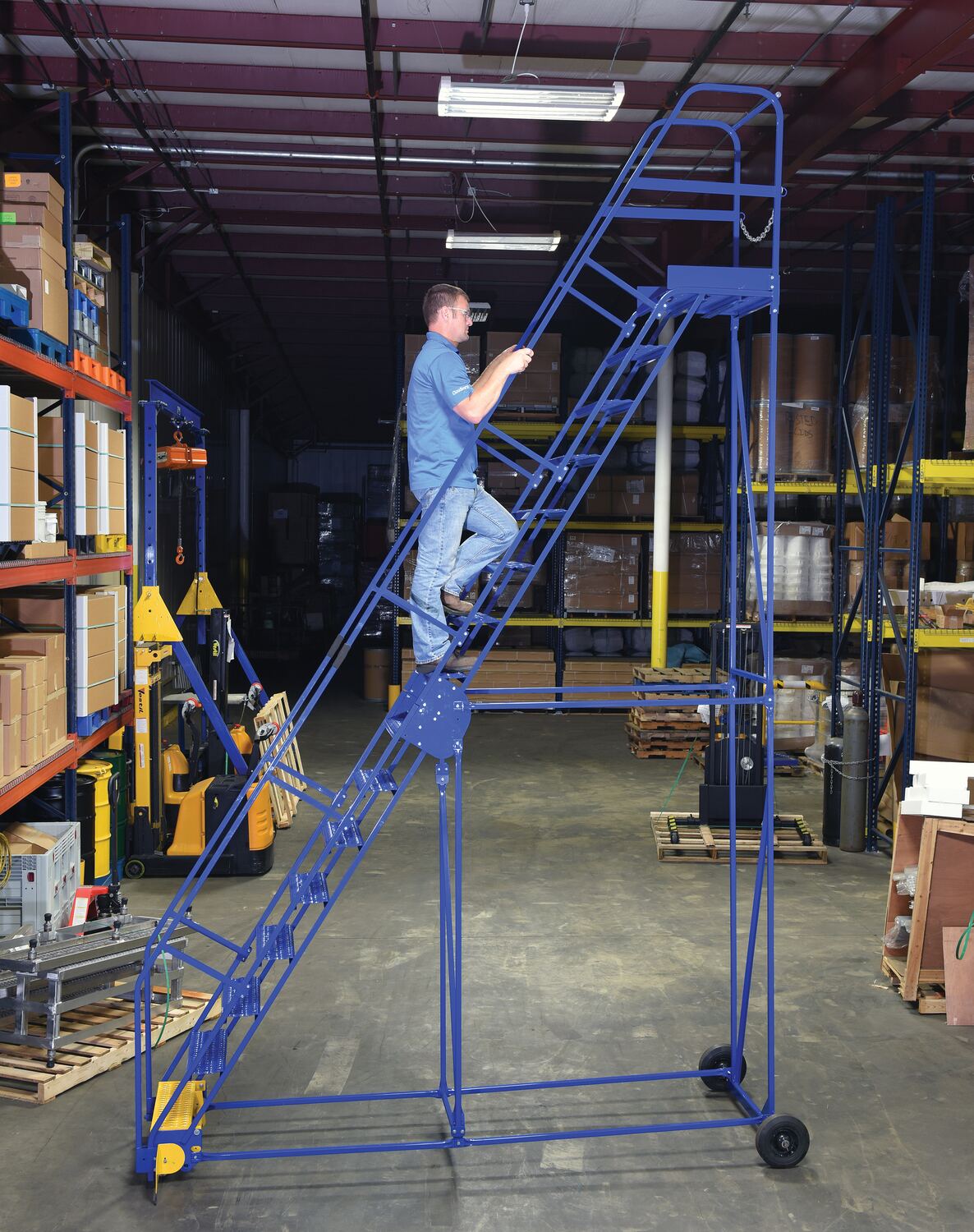 | Steel Rolling Warehouse Ladder 50 Degree 15 Grip Strut 23-9/16 In. Step Width 350 Lb. Capacity Blue | Uniform Capacity (lb.): 350 Number of Steps (qty.): 15 | 505 |