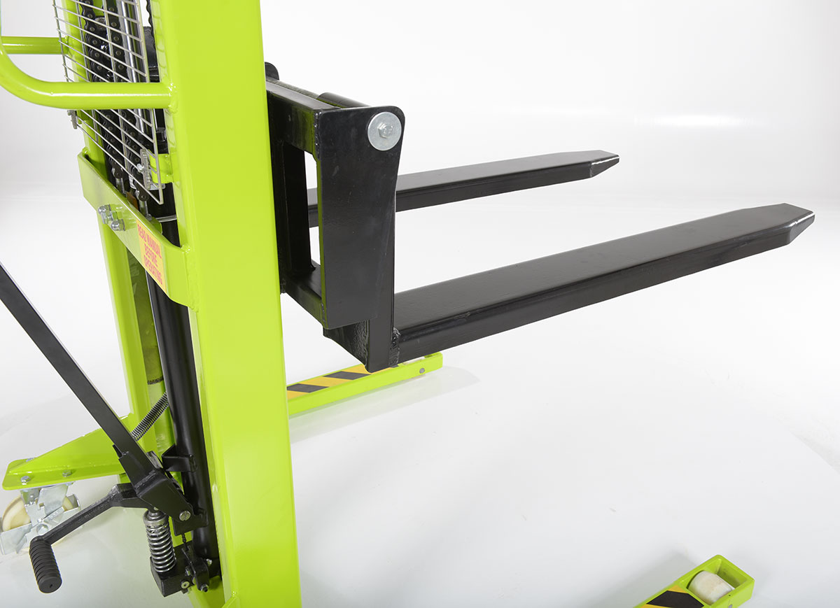 The Variable Height Stacker is great for a variety of warehousing departments. The unit is constructed of steel for strong support and durability during day to day use. The color is bright for high visibility from across crowded workplaces. The manual hand pump functionality is perfect for rising to precise positions. To use, simply slide forks of the unit through the pallet openings and lift to desired height.