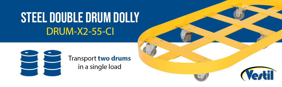 DRUM-X2-55-CI DRUM-X2-55-CISteel Double Drum Dolly with Cast Iron Casters 45 In. x 45 In. x 39 In. Two 55 Gallon 2000 Lb. Capacity YellowNet Capacity (lbs): 2000