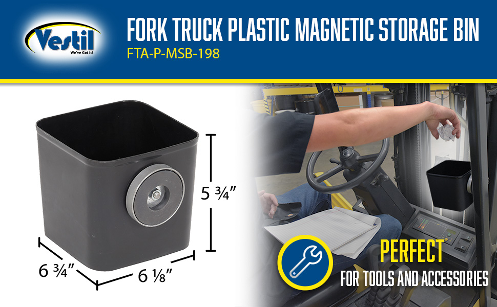 FTA-P-MSB-198 FTA-P-MSB-198Plastic Fork Truck Magnetic Storage Bin 6-3/4 In. x 6-1/8 In. x 5-3/4 In. BlackAttachment Method: Magnetic