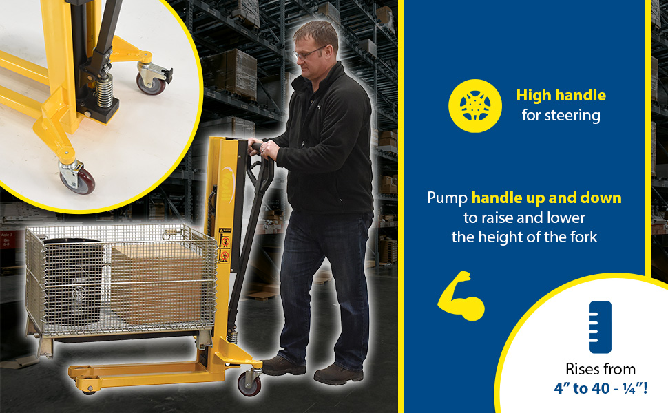 A single fork skid positioner is a new design of an old classic. Instead of the usual two skinny forks to lift open bottom skids, crates, and baskets this model has one large centered fork. The fork is open on 3 sides for easy loading and unloading of products. The high handle not only allows for steering, but as the pumping mechanism to raise and lower the height of the fork. Unit rolls on 5" poly-on-poly casters and includes a foot brake for secured positioning during transition periods. The compact design takes up minimal storage space, when not in use.