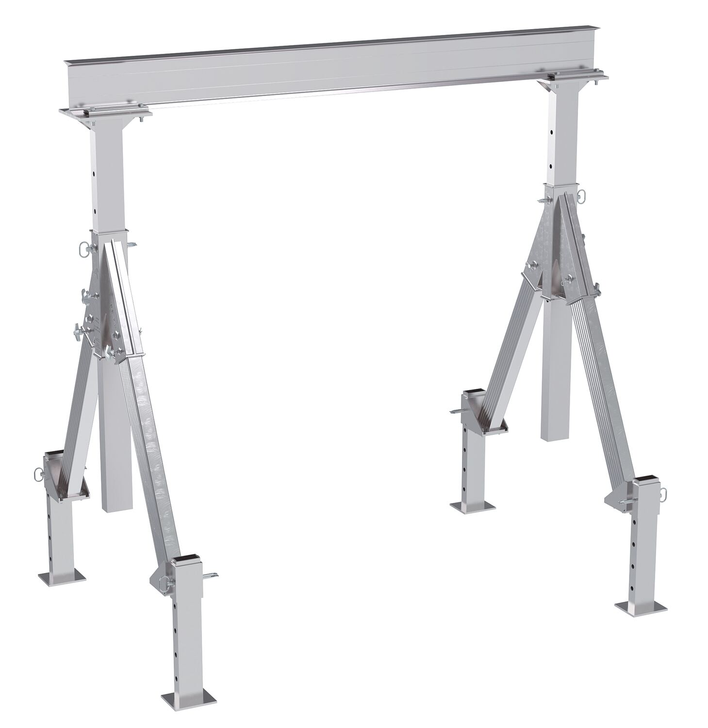 An adjustable height Aluminum Gantry crane is valuable asset in warehouse and manufacturing settings. The crane has an all-aluminum construction making it corrosion resistant and perfect for outdoor use. All pinned connections make it possible for personnel to set up and take down in just minutes. The adjustable legs allow the crane to be raised or lowered in increments. Each leg has a pin style adjustment design with pre drilled alteration holes. With a rectangle shaped base included on each leg, the crane has a strong foundational support. Hoists & Trollies can be ordered seperately.