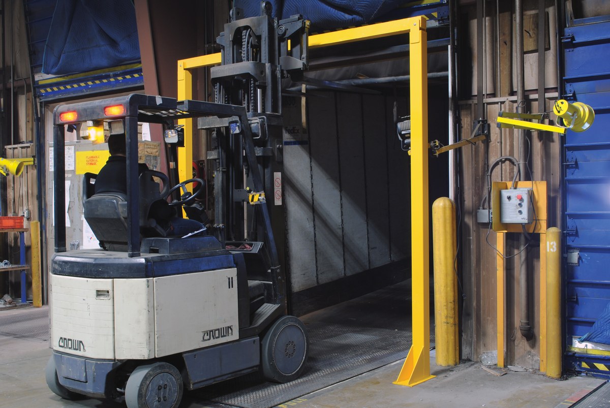 Economical Overhead Door Warning Barriers protect overhead doors from fork trucks and other traffic coming and going throughout each day. Intended for use as a warning system - not a fork truck stop. Constructed with tubular steel uprights and a 4" x 4" wooden beam across the top of the guard. The wooden beam can be easily and inexpensively replaced when damaged. Guard will not interfere with overhead door. Complete unit is painted high visibility OSHA safety yellow. Concrete installation kit available.