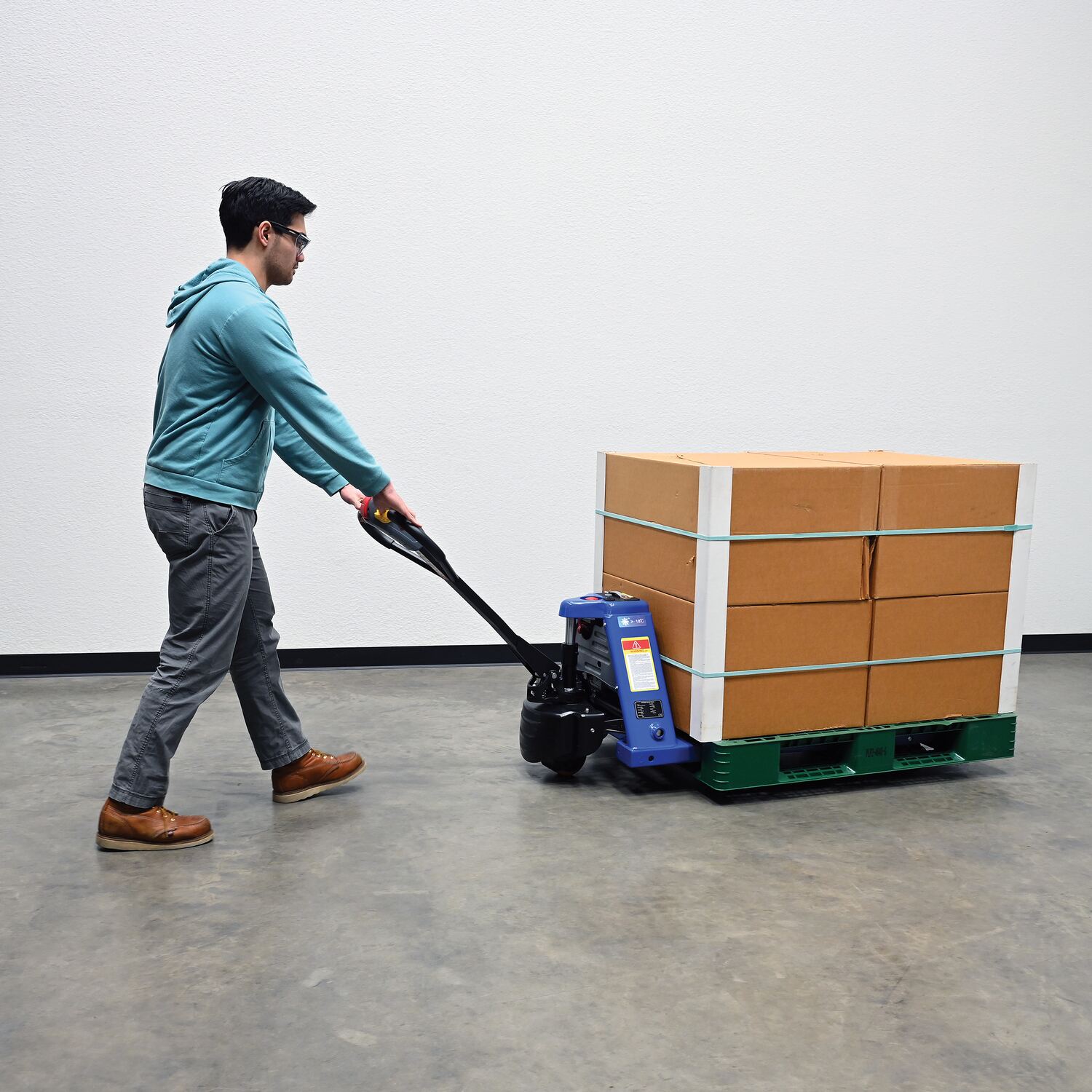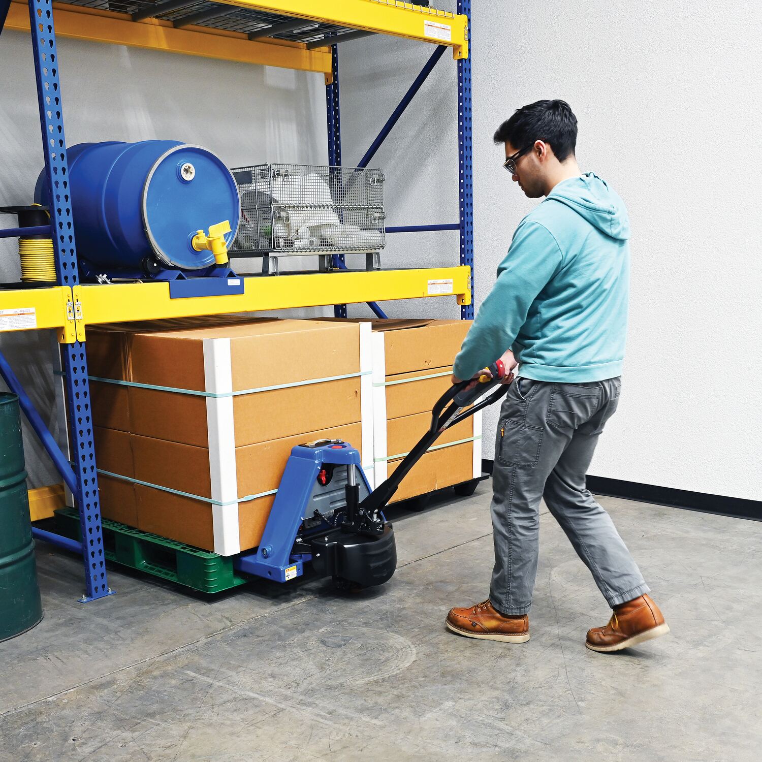 An electric pallet truck is the perfect combination of powered mobility and lifting. Instead of using the classic manual hand pump version, give yourself a break and try this powered lift edition! It gives the user the same capabilities to position the jack at the desired height, but without the chore of manually lifting. Not only that, but the mobile power also minimizes the time associated with transferring heavy loads between work areas. An open design provides access to all aspects of the truck for simple maintenance and cleaning purposes. The included lithium ion battery delivers a long life and countless charges.