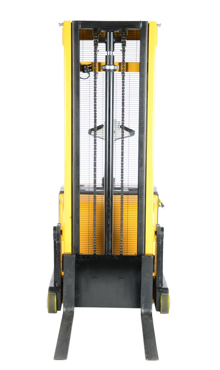Counter balance design is ideal for die loading, machine feeding, and for loading and unloading trucks. High torque 24VDC drive and lift motor handles heavy-duty jobs. Ergonomic handle features easy-to-operate throttle with infinite adjustment of forward and reverse speeds, lift/lower controls, proprietary safety-enhancing emergency reverse function, and horn. Includes an electromagnetic disc brake with automatic dead-man feature that activates when the user releases, the handle. Powered lift has four 6V batteries (except S-CB-62 & S-CB-118, which uses two 12V batteries), an integral battery charger, and battery level gauge. Stacker rolls smoothly on poly-on-steel steer & load wheels. Features 0.7 KW drive and 2.0 KW lift motor. 3-4 hour operation at full charge - 8 hours when used intermittently. Adjustable forks suitable for different pallets. Individual forks are 3⅛" wide on series S-CB and 4" on series S-2CB. Overall size is 32."W x 78"L on series S-CB and 35."W x 110"L on series S-2CB A high level of serviceability simplifies maintenance and prolongs equipment life. Easy access battery compartment simplifies battery maintenance.