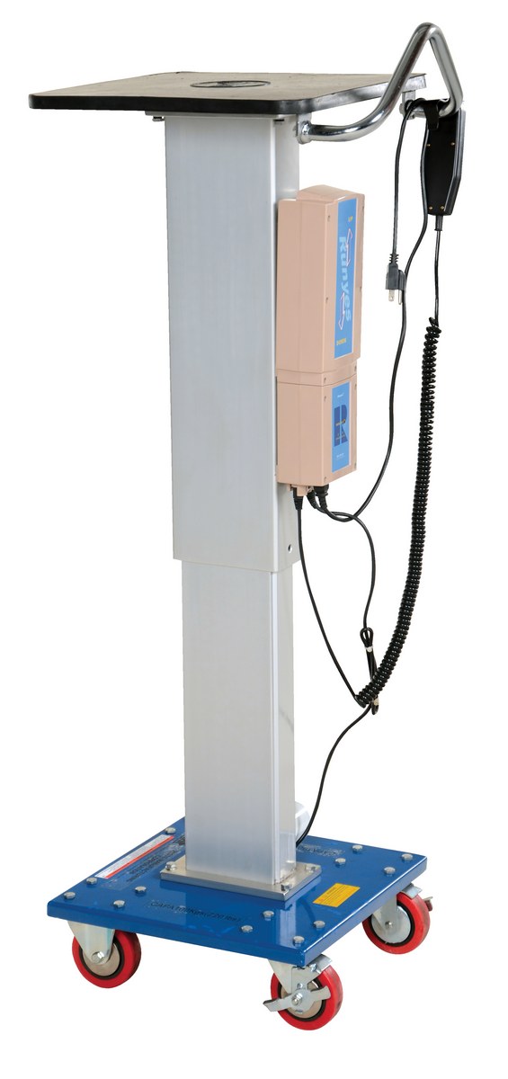 The linear actuated post-table is a great asset in manufacturing and industrial settings. The table raises and lowers for exact positioning when needed most. The linear actuator allows the unit to stay level for from start to finish. The hand held pendant with emergency stop control, allows user to control the table a small distance away while maintaining the proper work position. Linear actuator table is powered with lithium battery and features an on-board battery charger for continual use and casters for smooth transporting for site to site. The hand held pendant control connects to the power unit with a six foot coil cord for easy use when distance from the unit is required. An emergency stop button is standard on the hand control.