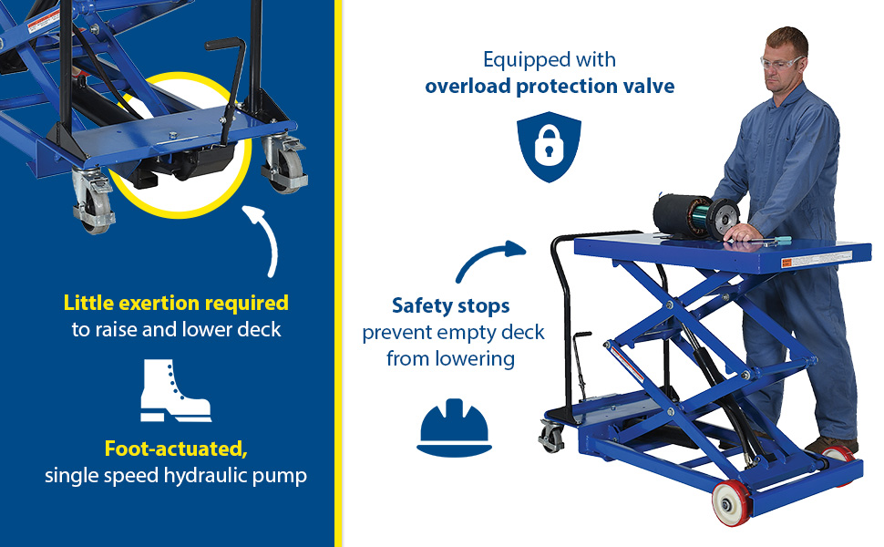 Constructed of heavy duty steel and designed to withstand the most demanding industrial environments. Ideal for lifting and transporting loads, order-picking, die handling, and for use in support of assembly operations. Little exertion is required to raise and lower the deck with the high quality, foot-actuated, single-speed hydraulic pump. The hydraulic system is equipped with an overload protection valve. The hand operated carts have safety stops to prevent an empty deck from lowering while performing maintenance. The foot operated carts have a unique tilt-up table top that allows for safe and easy maintenance. Two (2) rigid front casters and two (2) rear swivel polyurethane casters with brake provide a high degree of maneuverability; each swivel wheel is protected by guards and is equipped with brakes.