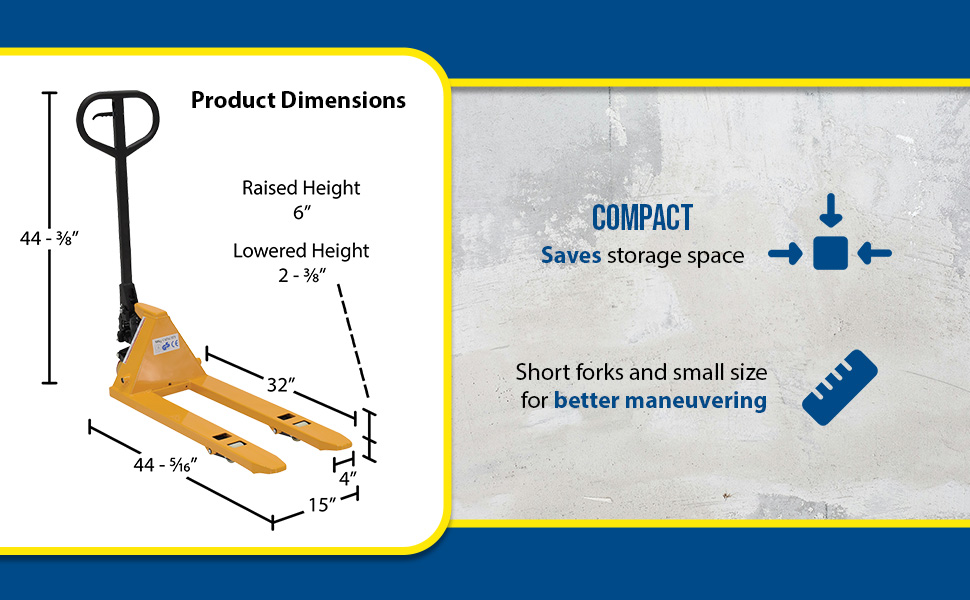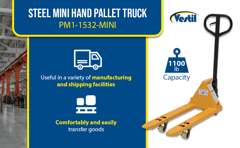 PM1-1532-MINI PM1-1532-MINISteel Mini Hand Pallet Truck 45 In. x 15 In. x 45 In. 1100 Lb. Capacity YellowUniform Capacity (lb.): 1,100