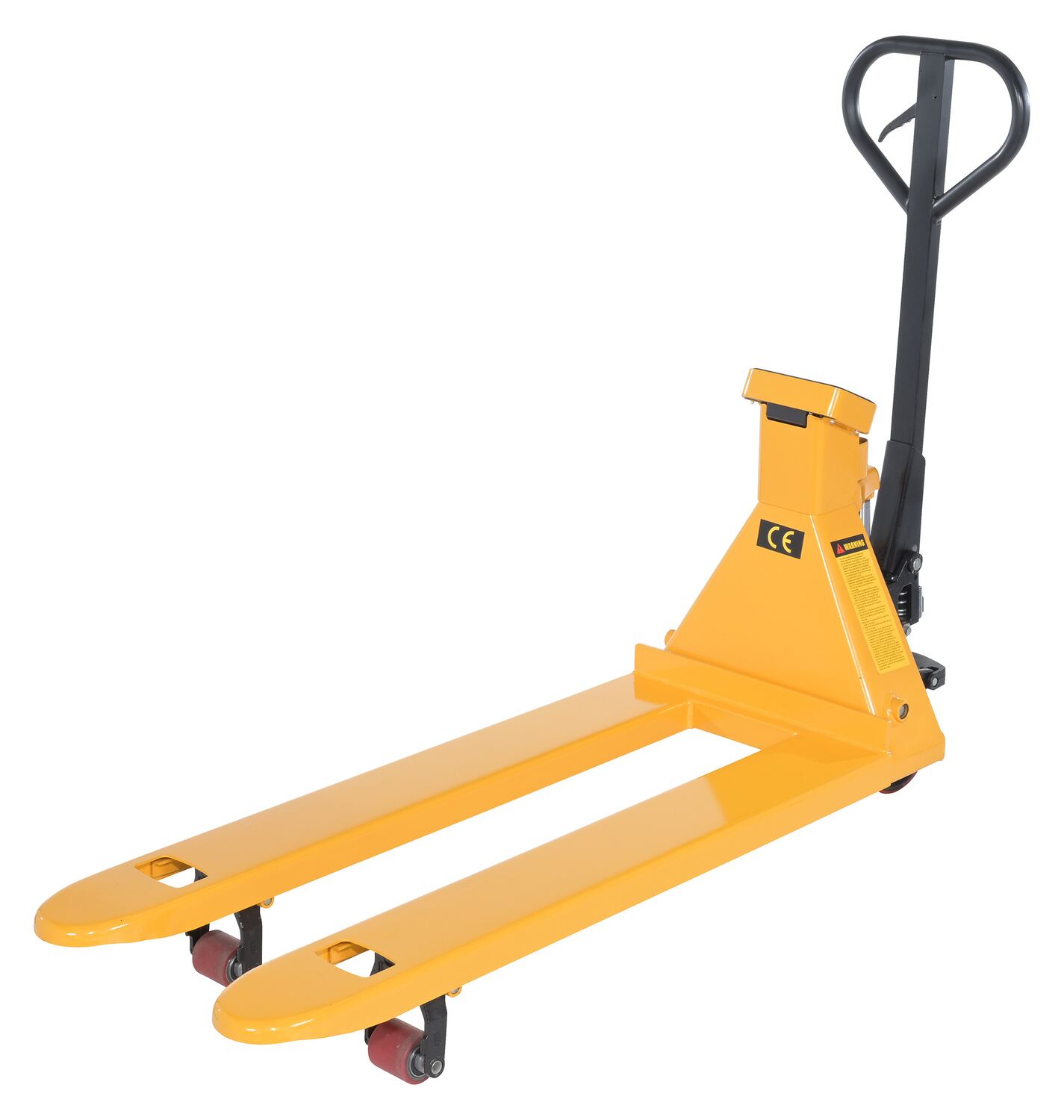 The Pallet Truck with Digital Scale allows you to weigh your load on the spot for maximum efficiency. The frame uses heavy-duty steel construction for maximum strength and durability. This model is very user friendly and is suitable for low height lifting. The built-in scale allows you to weigh your load as you are handling it. The scale is selectable in a variety of increments to adjust to the size of your load. It has keyboard calibration and functional setup with automatic zero capabilities. Digital filtering is used to help compensate for vibration and motion to make the Pallet Truck with Digital Scale smooth and accurate. Scale accuracy is +/-0.1% of the applied load. Forks are 7" wide each. Factory calibrated for shipping destination. AC adaptor included. Powered by 6 AA batteries. (Four (4) AA batteries included in units PM-2048-SCL-LP-SS and PM-2748-SCL-LP-SS). Models ending with "E" are economy models. Those skus have a scale powered by (1) one 6V battery.