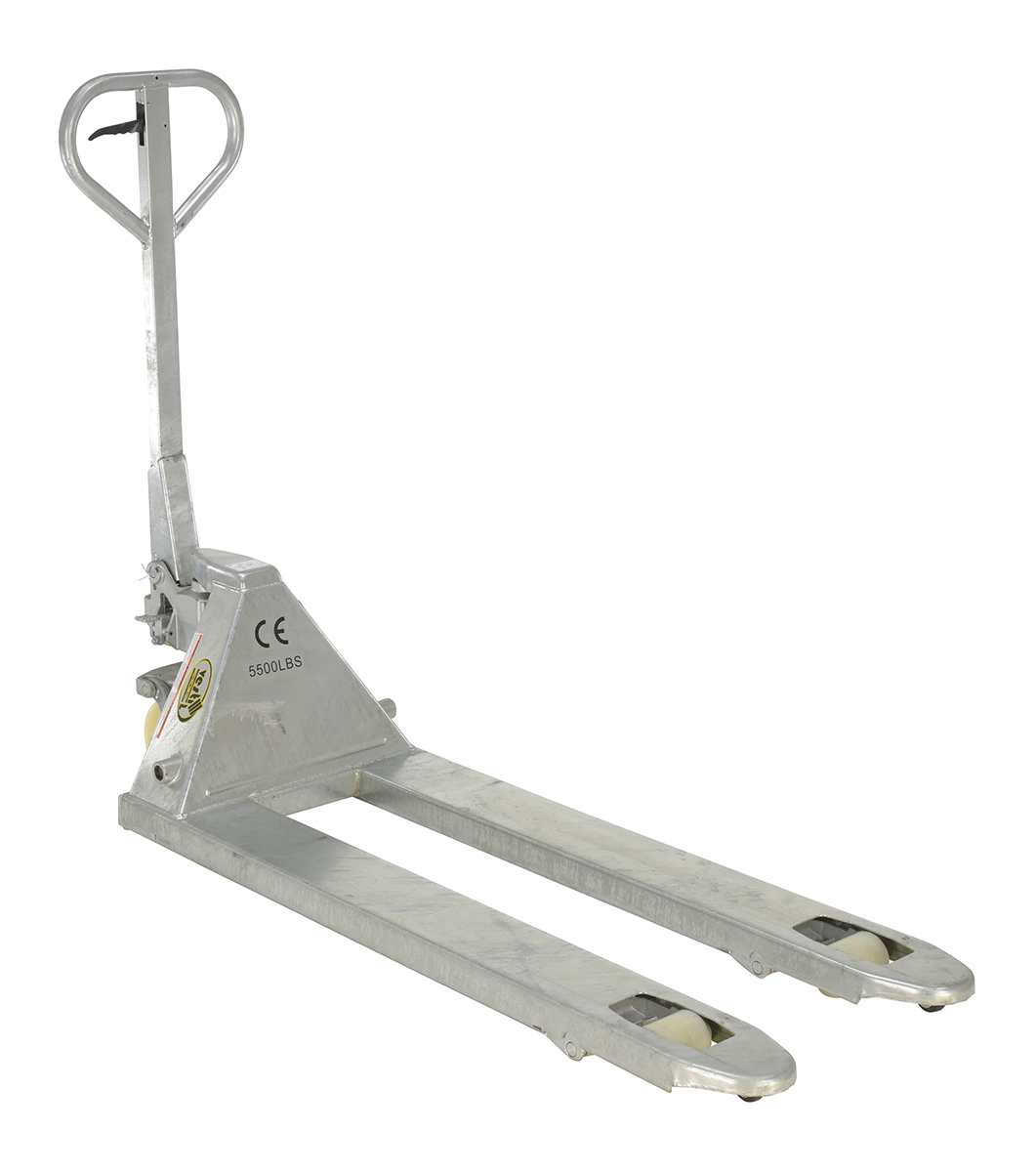 Galvanized and Zinc Coated - Ideal for corrosive environments. Full-featured pallet trucks were designed for chemical, pharmaceutical, and wash-down applications. 5,500 pounds uniform capacity.