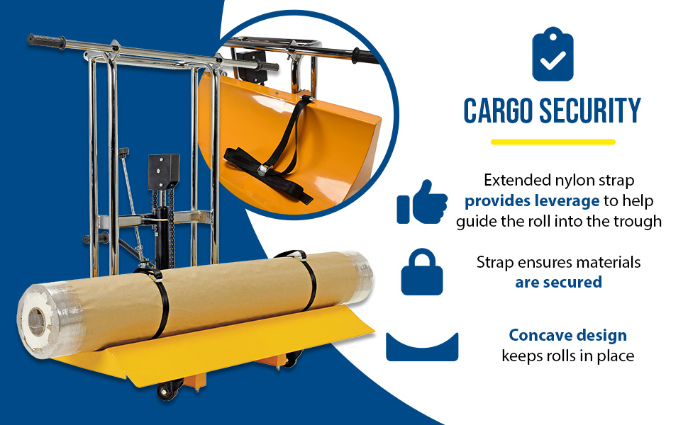 Roll Lifter and Transporters allow single users to maneuver heavy duty rolls onto the lifter and then directly onto the printer feeder. Extended nylon strap provides leverage to help guide the roll into the trough and ensure materials are secured for transport. Concave trough design of the media tray stabilizes rolls for transit. Foot pump allows for smooth and effortless lifting. Heavy duty swivel casters in both front and rear allows the user to maneuver through standard doors and narrow passages. Maximum roll diameter is 15-3/4".