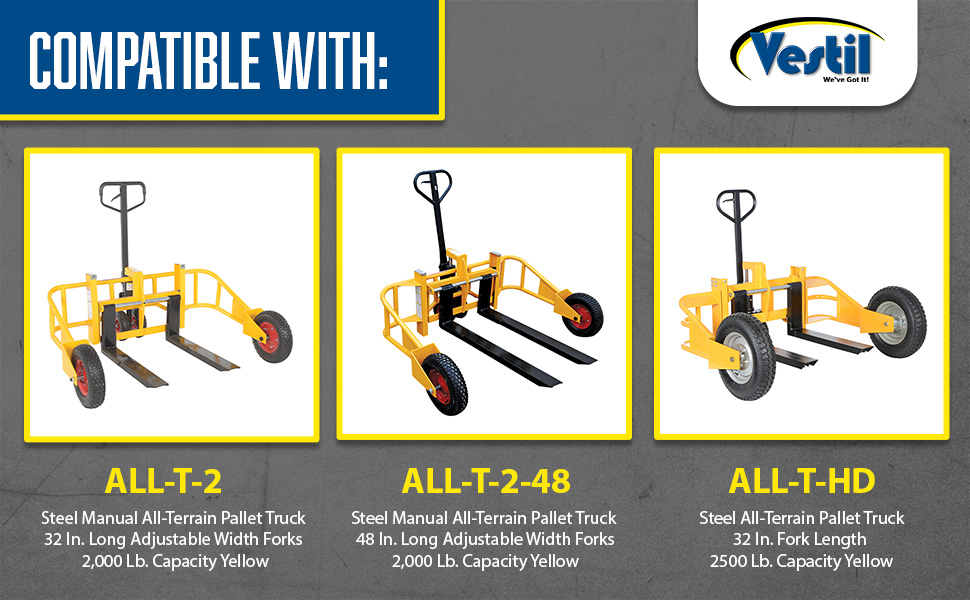 ALL-T-2 ALL-T-2Steel Manual All-Terrain Pallet Truck 32 In. Long Adjustable Width Forks 2,000 Lb. Capacity YellowUniform Capacity (lb.) at 12 (in.) Horizontal Load Center: 2,000