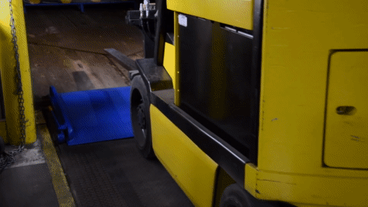 Steel Truck Dockboards are constructed of high strength (55,000 psi) steel for long life. Beveled edges on both ends permit smooth entry and exit. Deck is diamond plated for safe, efficient use. Welded safety curbs for maximum strength. Locking legs minimize ramp movement and are uneven to allow the dockboard to sit canted for easier floor pickup by fork trucks when not in use. Legs are located 12" from the edge of the dockboard. The bend is 11 degrees and 9" from beveled edge. Standard with Lever Lift for quick portability with fork truck. Manufactured in compliance with OSHA. Optional accessories: lifting chains, span locks, span pins/holes, and removable pickup loops.