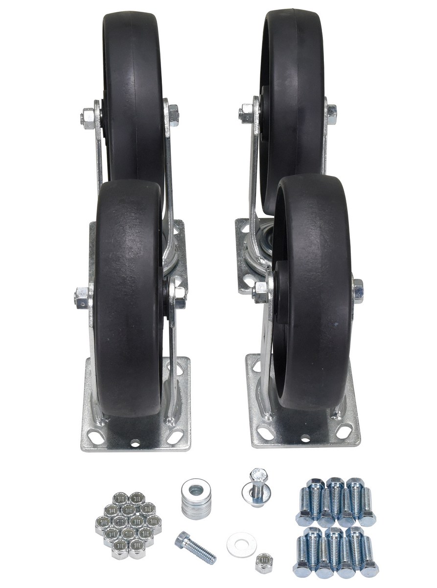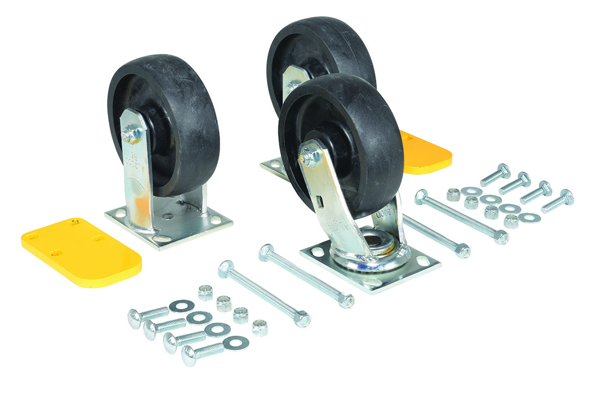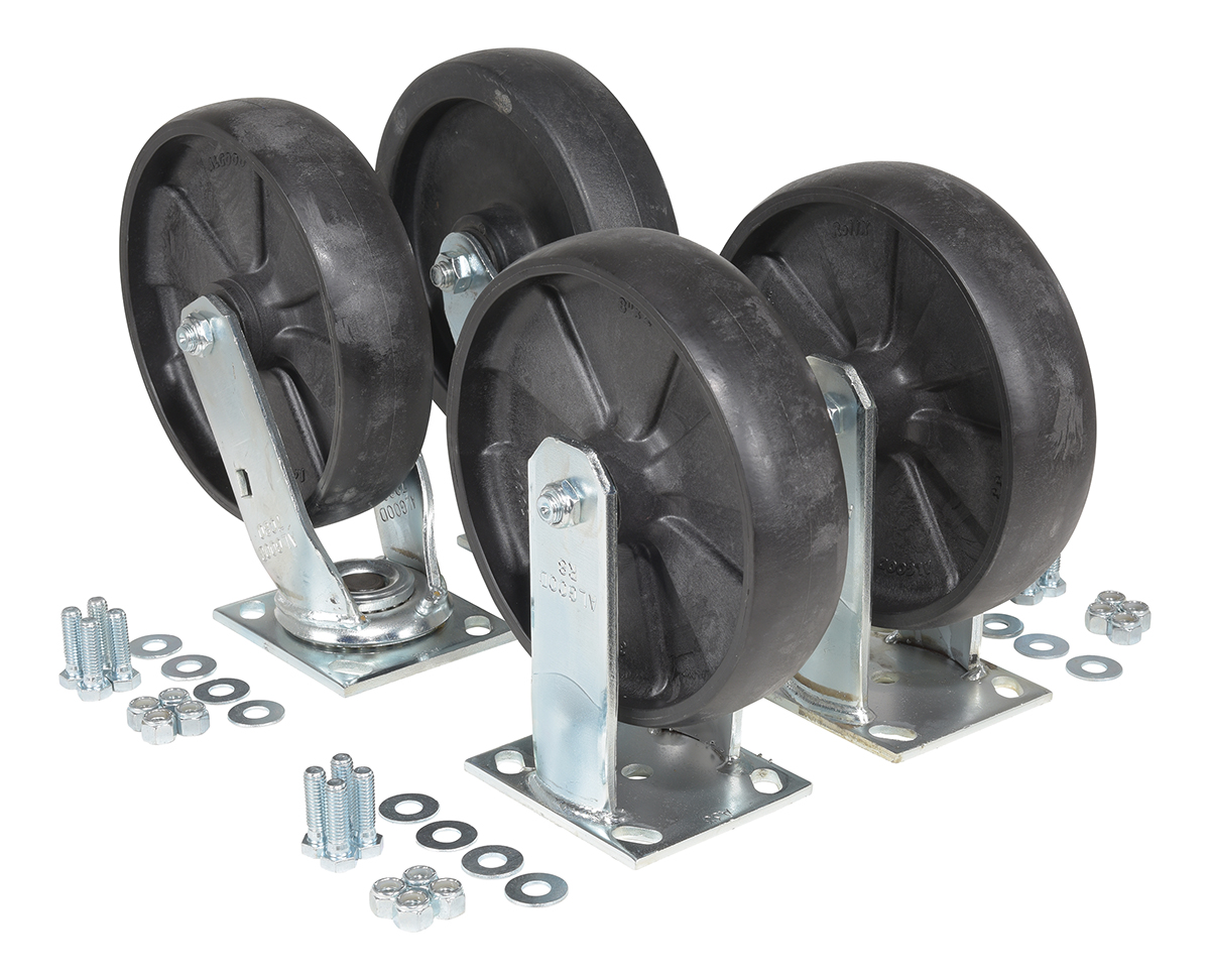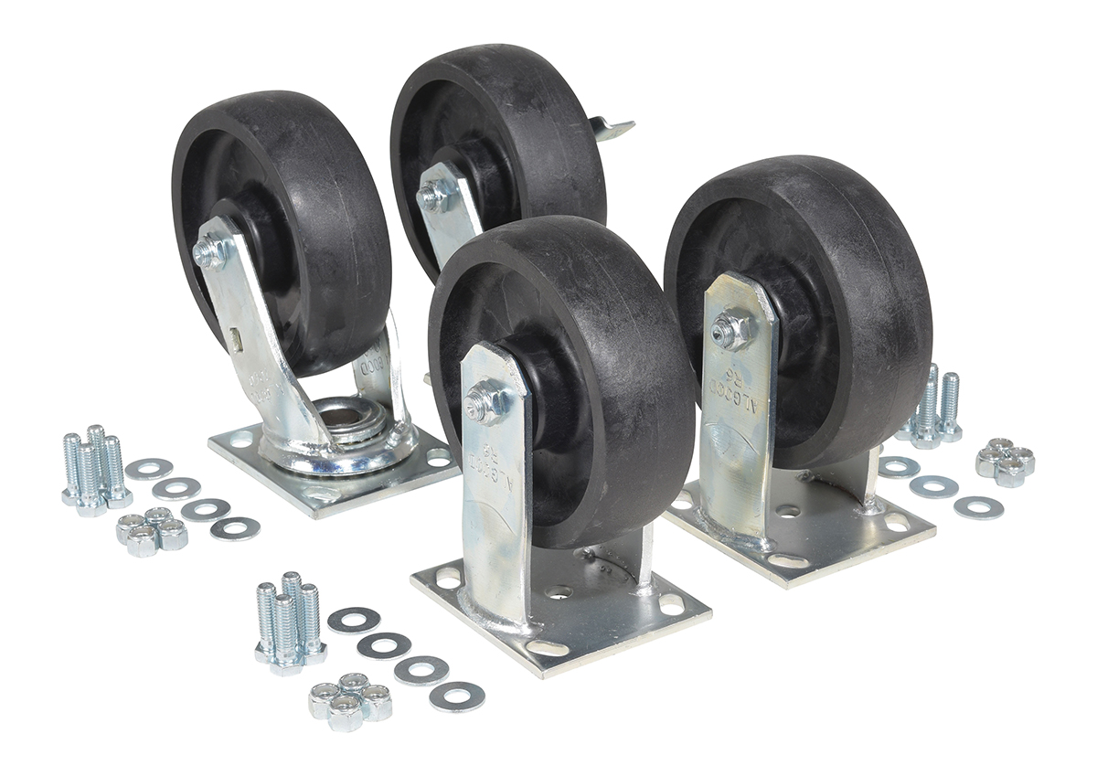 The mold on rubber and poly on steel casters with their soft tread are quiet and ideal for uneven floors. The glass filled nylon casters provide a smoother roll. The semi-steel and ductile steel casters are the most durable. Your sales associate can help you match the capacity and size of the caster kits to your hopper.