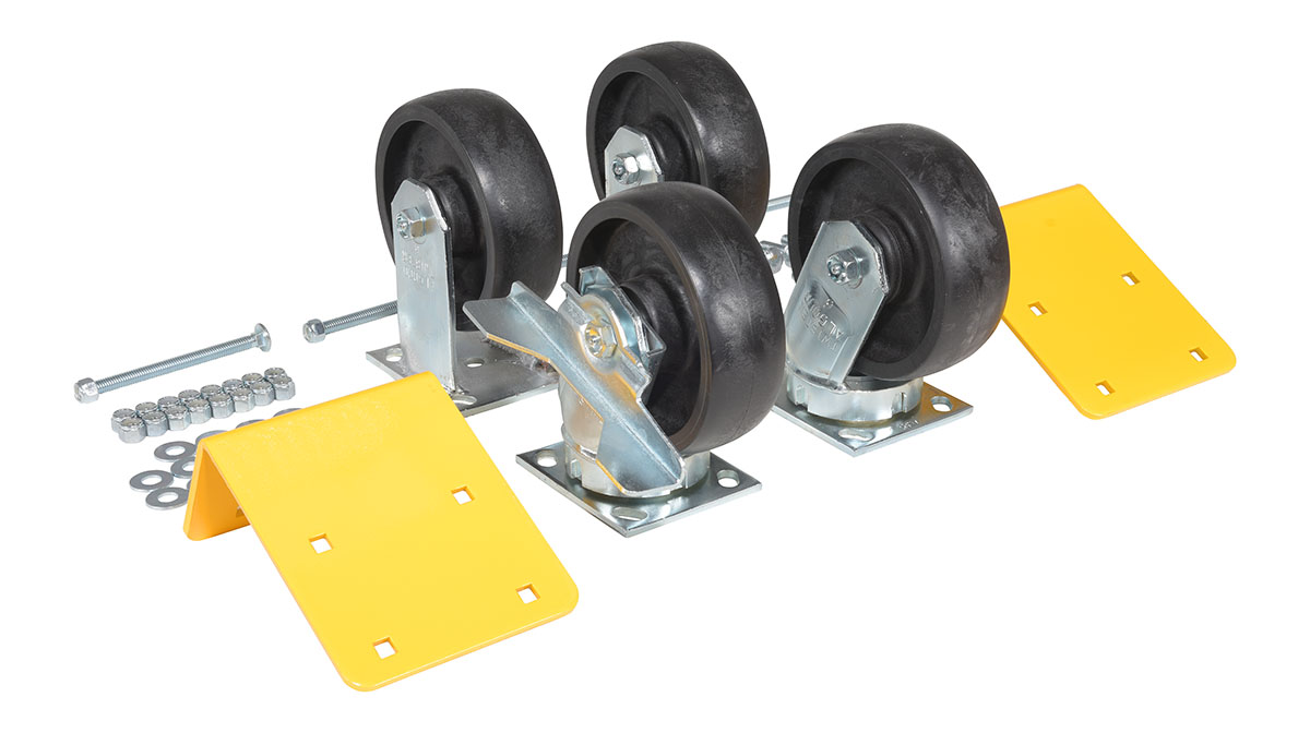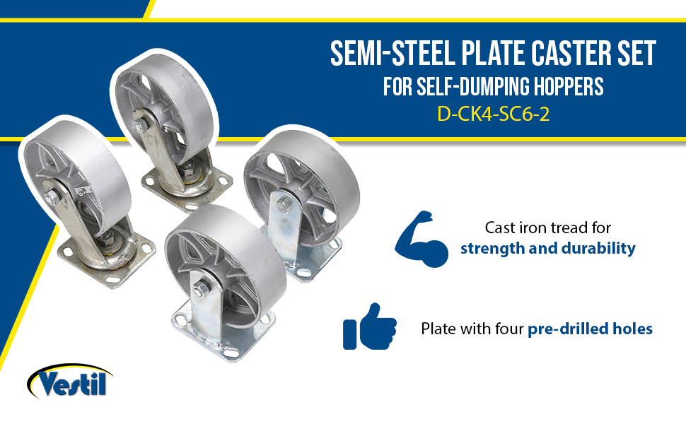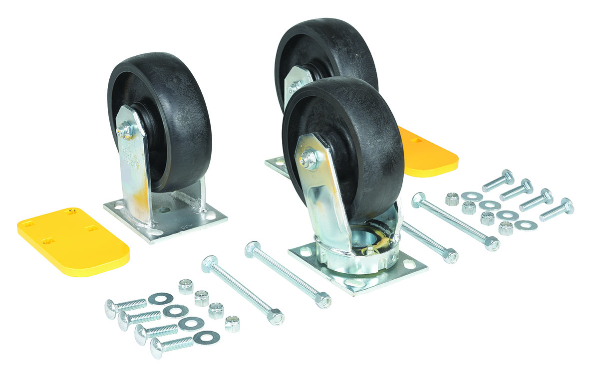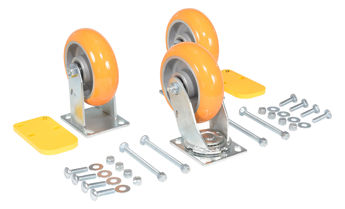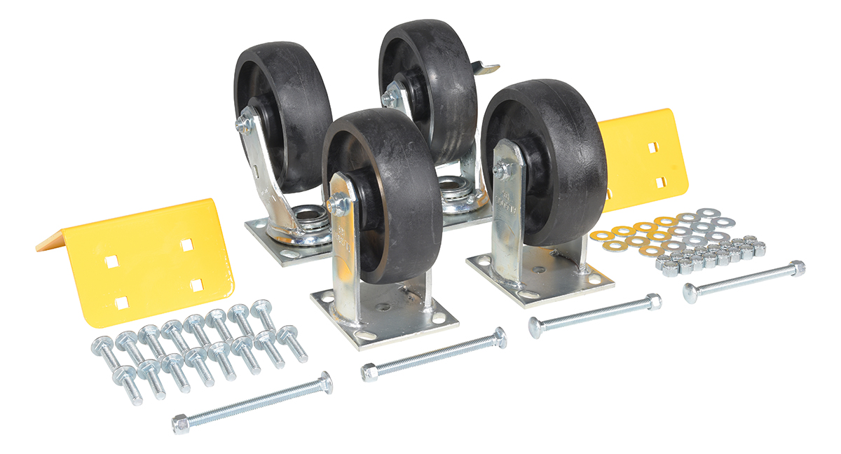 The mold on rubber and poly on steel casters with their soft tread are quiet and ideal for uneven floors. The glass filled nylon casters provide a smoother roll. The semi-steel and ductile steel casters are the most durable. Your sales associate can help you match the capacity and size of the caster kits to your hopper.