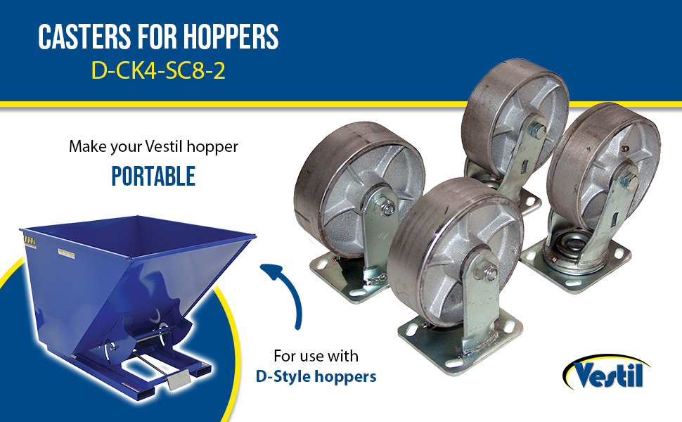 Transport loads with portable hoppers. The maximum weight capacity is the lowest weight capacity of either the hopper or the caster. Weight of hopper must be considered when calculating usable capacity. Sets include two (2) rigid, two (2) swivel casters. For the H series 1/4 and 1/2 cubic yard hoppers only three (3) casters are included, two (2) rigid and one (1) swivel, in addition to bolt on stabilizing legs for the back. Casters are bolted-on by utilizing the factory stamped hole in the fork tubes. Casters are shipped uninstalled to prevent freight damage.